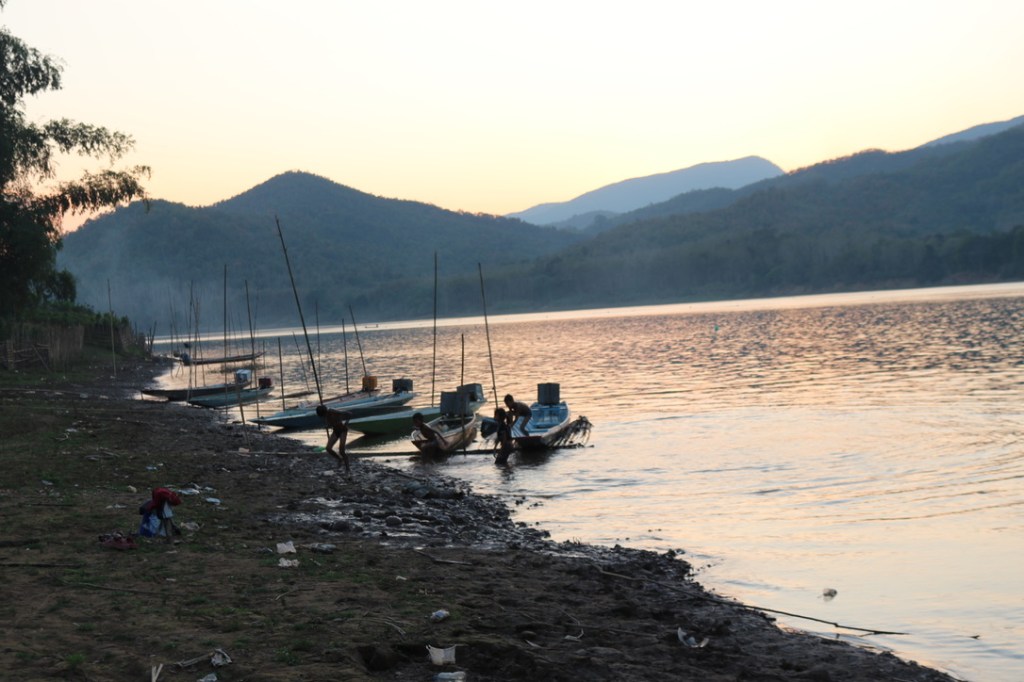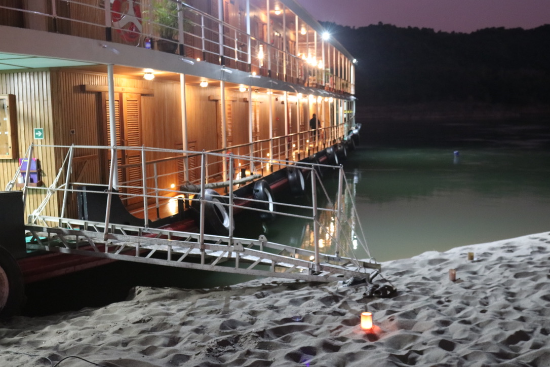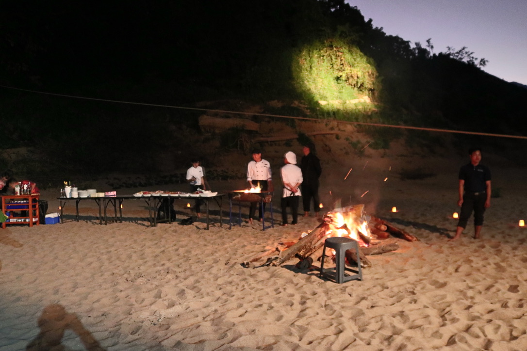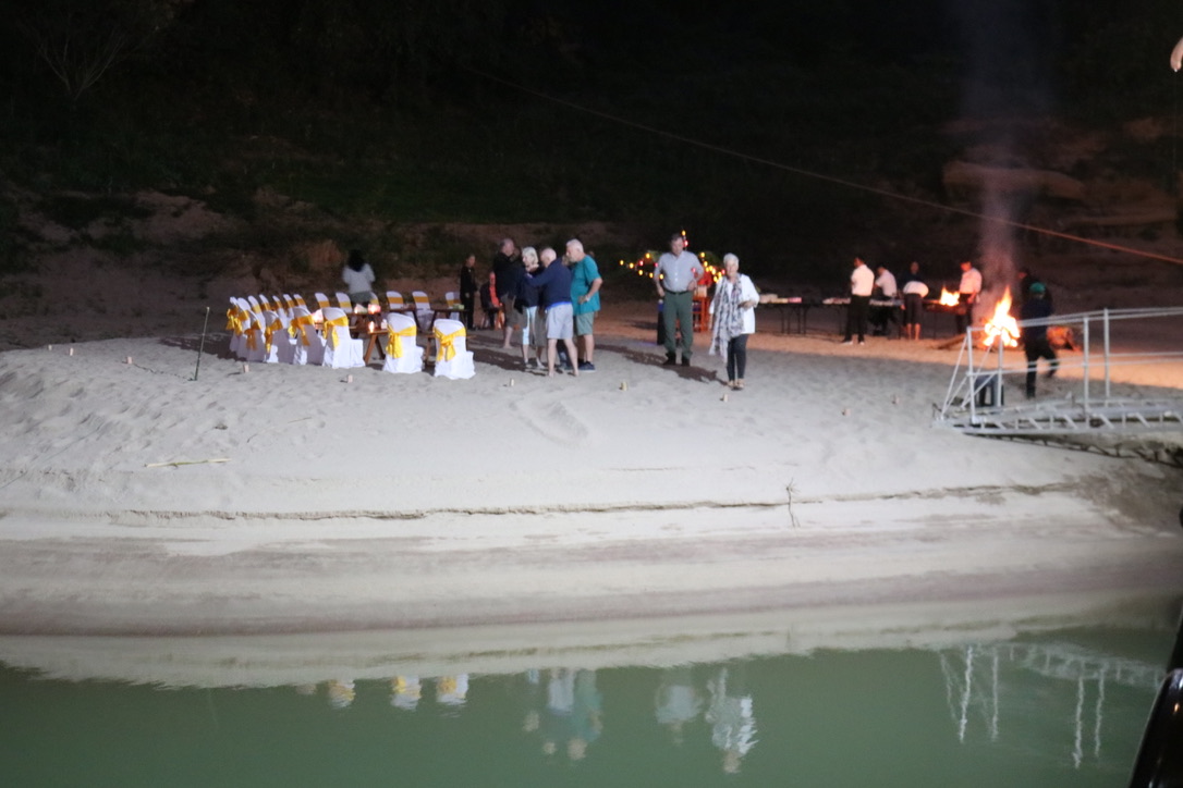 Downstream of the dam the river returns to normal albeit shallower than it was before the dam was constructed. We anchored for the evening on a sandbank south of the dam. It was quite a special location with views up the river to the mountains we had passed between and down river to the next days journey. The ships crew set up a fire and BBQ on the sandbank and we went ashore for cocktails and the evening meal. We spent the time with Joerg and Gabby, chatting, looking at the stars and sharing life stories. Towards the end of the evening we sent Khom Ly (Fire Lanterns) into the night sky. To see them floating upwards against the background of the stars and constellations was a moment in time which felt very special. We then danced barefoot on the silky sand to Abba and Lao music before retiring to bed. It was a day and evening that we did not want to end.