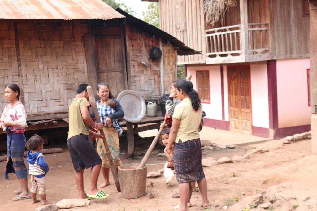 The afternoon was a trip to a different village – Kaengken Village (Pak Baeng) which was a mixture of lowland and and Highland people. We arrived as two ceremonies were taking place – the birth of a baby – one month after the birth so that the mother had recovered and the baby was going to live – secondly a wedding ceremony. The entire lower village was very drunk and very friendly! We were invited into the father’s house and offered Lao Whiskey and then to the wedding ceremony were we were invited to dance whilst drinking beer. Afer a little while we extracted ourselves and walked up to the highland village – after the noise and drink lower down this seemed very peaceful and calm!