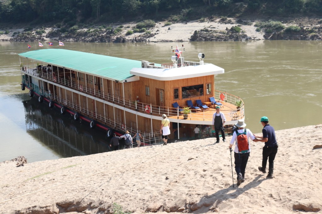 Upon returning to the boat we went back up river and moored just below Pak Lai. We watched as the long boat brought up the passengers for the Pandaw boat on the opposite river bank that would commence its trip upstream tomorrow morning. That same river boat would come across to us in the morning to take us down river towards Vientiane.