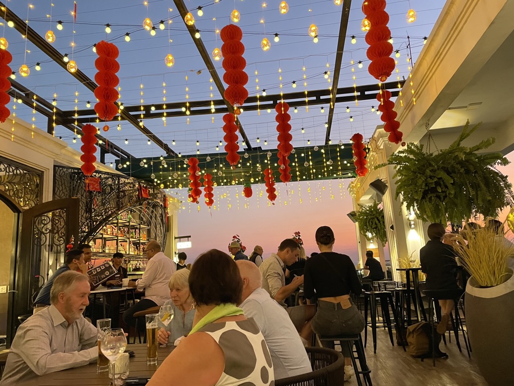 Not much was done in the afternoon. Back to the hotel where we snatched some sleep before going to the Sky Bar for drinks – in time for sunset. As this would be our last meal together we made the most of the drinks and company. It was also the last time we would see Vieng who was travelling back to his family for a couple of days before the next tour began. Solar, the barman had stayed on to supervise the evening and ensured we were all looked after. Final farewells were made and I took the lead in standing up to thank all of the Pandaw staff. We were the last to leave with Derrick, Jane, Anna, Michael and Sandra. The wine kept flowing as well as the beer. We had a warm feeling as we went to bed after a lovely end to a fantastic holiday.