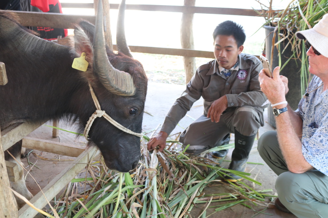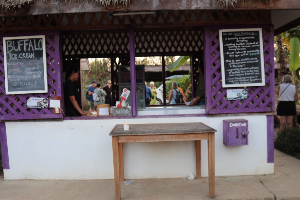 The last stop was the Buffalo Farm. There was a silent groan at this as it had been a long day with a 0500 start but this ended up being the best visit of the entire day and on a par with visiting some of the villages. An Australian and American women had come out to rent land to set up a buffalo milk production centre. Surprisingly Laos do not make milk either from cowes, goats of buffaloes. This causes significant vitamin deficiencies in young children. So single handedly they started an education and breeding programme with local farmers. Teaching them the benefits of buffalo milk in simple rice dishes and every day meals. They rented pregnant buffaloes from the farmers to collect the milk on their farm before sending them back to the farmers once the calf had weaned. As well as producing local milk they also had worked out how to make mozzarella cheese and were starting to create a market for its use. This took a number of years to achieve and again Covid blew a hole in many of their plans. Now they have expanded into goats and rabbits – again to improve nutrition and create additional income for farmers. They have been so successful that Cambodia has asked them to help set up a similar programme. The farm also had a ice cream shop by the side of the road – with the ice cream being made from buffalo milk. A delicious end to the visit.