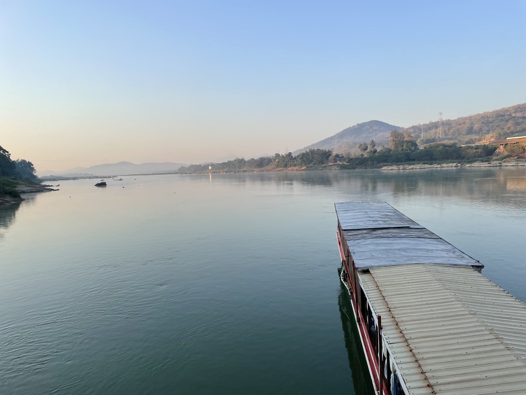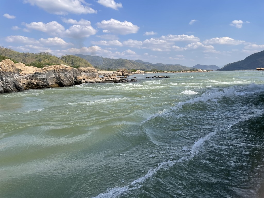 For the first couple of hours we had Thailand on one side of the river and Laos on the other, until the Mekong turned and flowed just through Laos. As we travelled down the river we passed what looked like gravel extraction from the river bed but turned out to be gold panning. The river was fast flowing and twisty with many rocky sections leading to some turbulence. After lunch we had an hour language training – more an introduction to Laos, its people and its culture. With the exception of the head chef the entire crew were Lao.