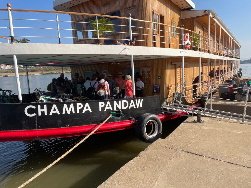 This was our last full day on the boat. As a result of low water levels, probably exacerbated or even caused by the dam that has been built, we will transfer from Champa Pandaw to a shallower draft river cruise boat for the down-stream travel tomorrow. Even that boat cannot get as far as Vientiane and we will need to stop after 5 hours to get a minibus.