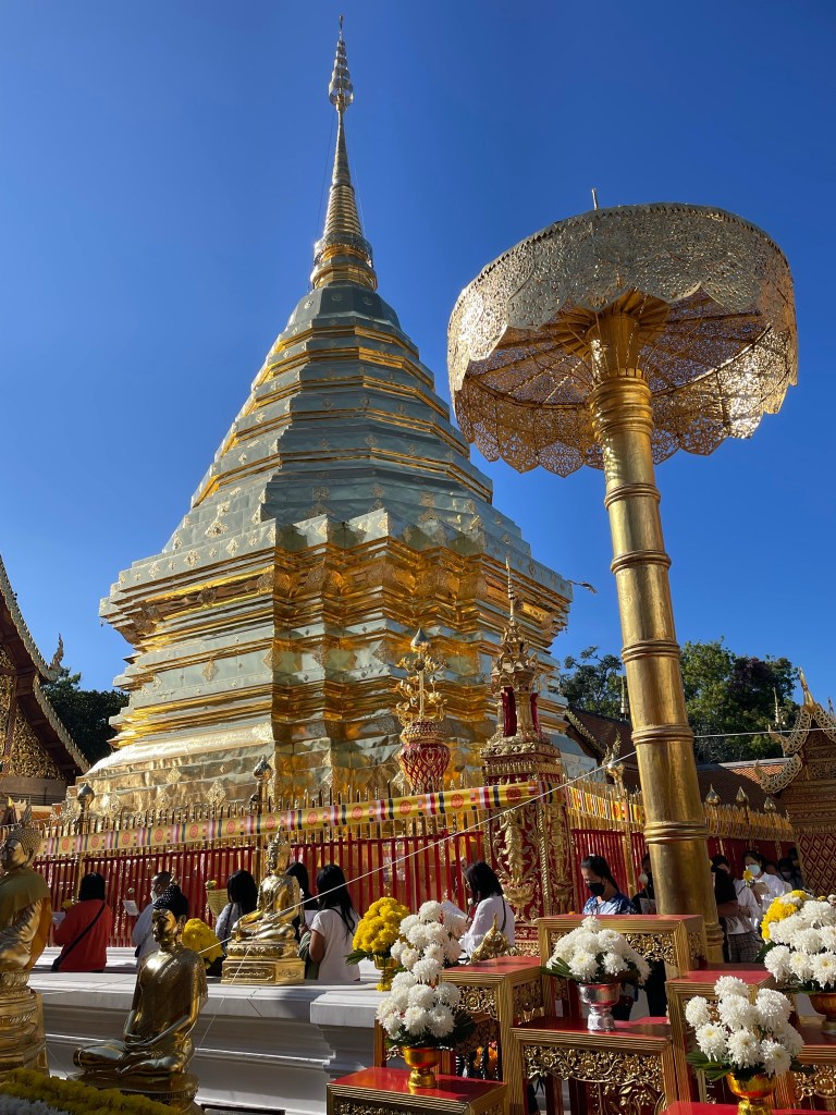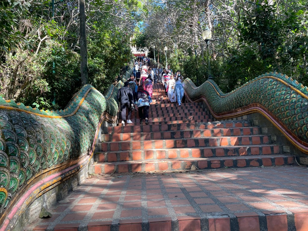 The final temple we visited was Was Phra That Doi. This was outside of Chiang Mei – higher in the mountains. The location was apparently chosen by an elephant who was given half the shoulder blade of the Buddha and left to walk until it lay down and died and this was the spot where it was believed that the temple should be built. To get to the temple we had the option of a cable car or the steps. I volunteered for the steps – quite steep but not too long. Down each side of the steps was the very long body of a dragon – Naga. I cannot quite remember the story associated with the dragon but I think it was associated with its desire to become a human form which was not granted but in compensation it would forever be remembered as it would welcome all worshippers to the temples. The grounds of the temple were very busy. Amy was a little bit more open about the resentment felt and their wariness of China who was putting a lot of money into Thailand including paying for refurbishment of the temples. But everyone knew there would be a price to pay for this in years to come. This became a bit of a theme as we travelled into Laos.