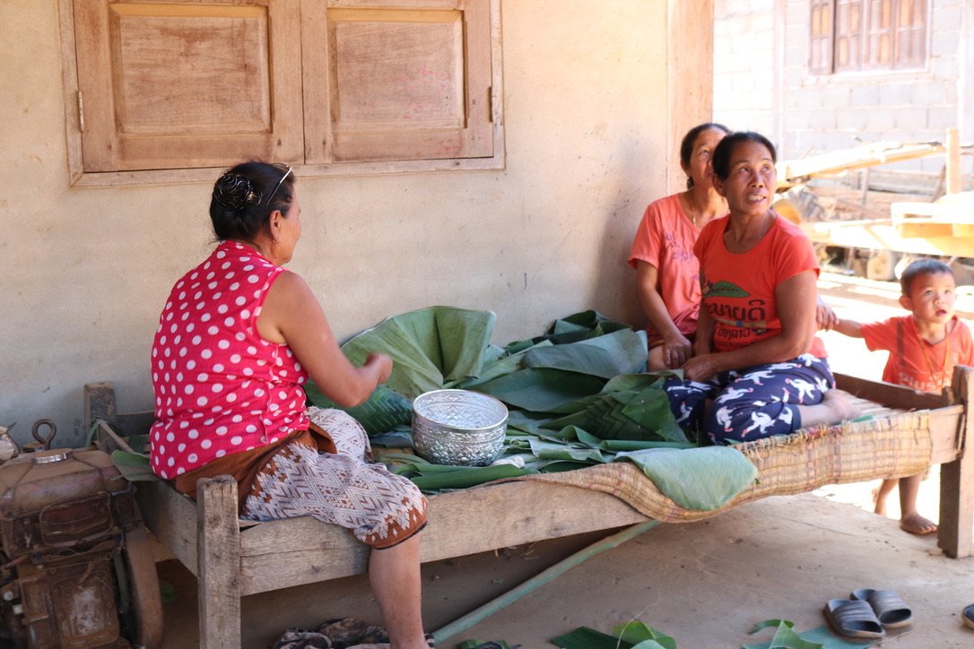 The original location we were going to moor for the night was unsuitable as it was right next to a hotel and it was felt it would be too noisy. Hence we travelled a little further down river past Pak Lai to a small village and the opportunity to look around another one – one last time. Gillian stayed on board – by this time it was very hot and humid – 32 deg+. The village was very modern and as the people were Lao Lowland the houses were built on stilts. However as many of them had concrete floors, there were now 2 stories high with the lower level for storage or a large open area. The village was preparing for a wedding with the table set out and decorations being made. There is still the tradition of the man and his family visiting the brides house and negotiating a dowry for the bride. We met one set of mothers who were preparing gifts and decorations for the visit of their son/grandson to the future wives house.