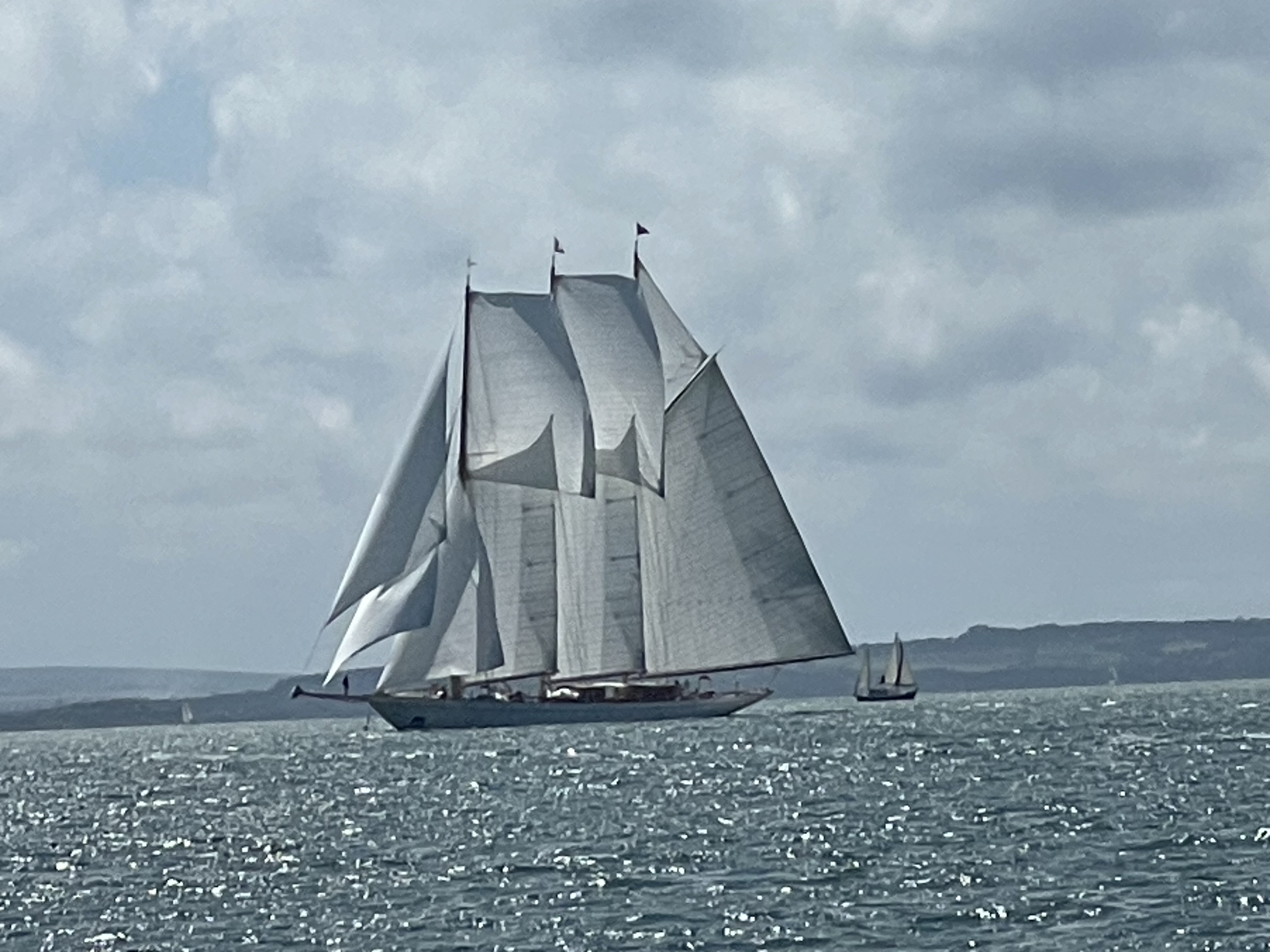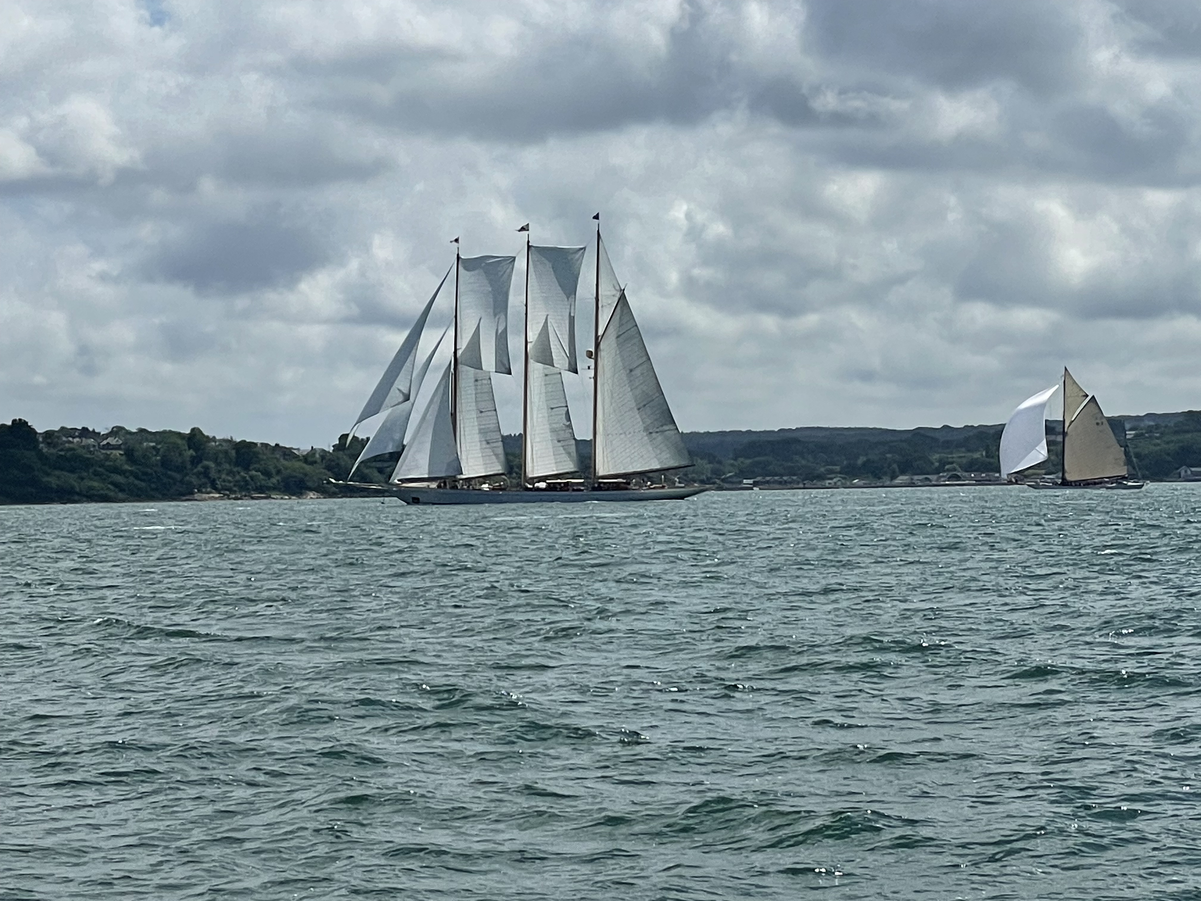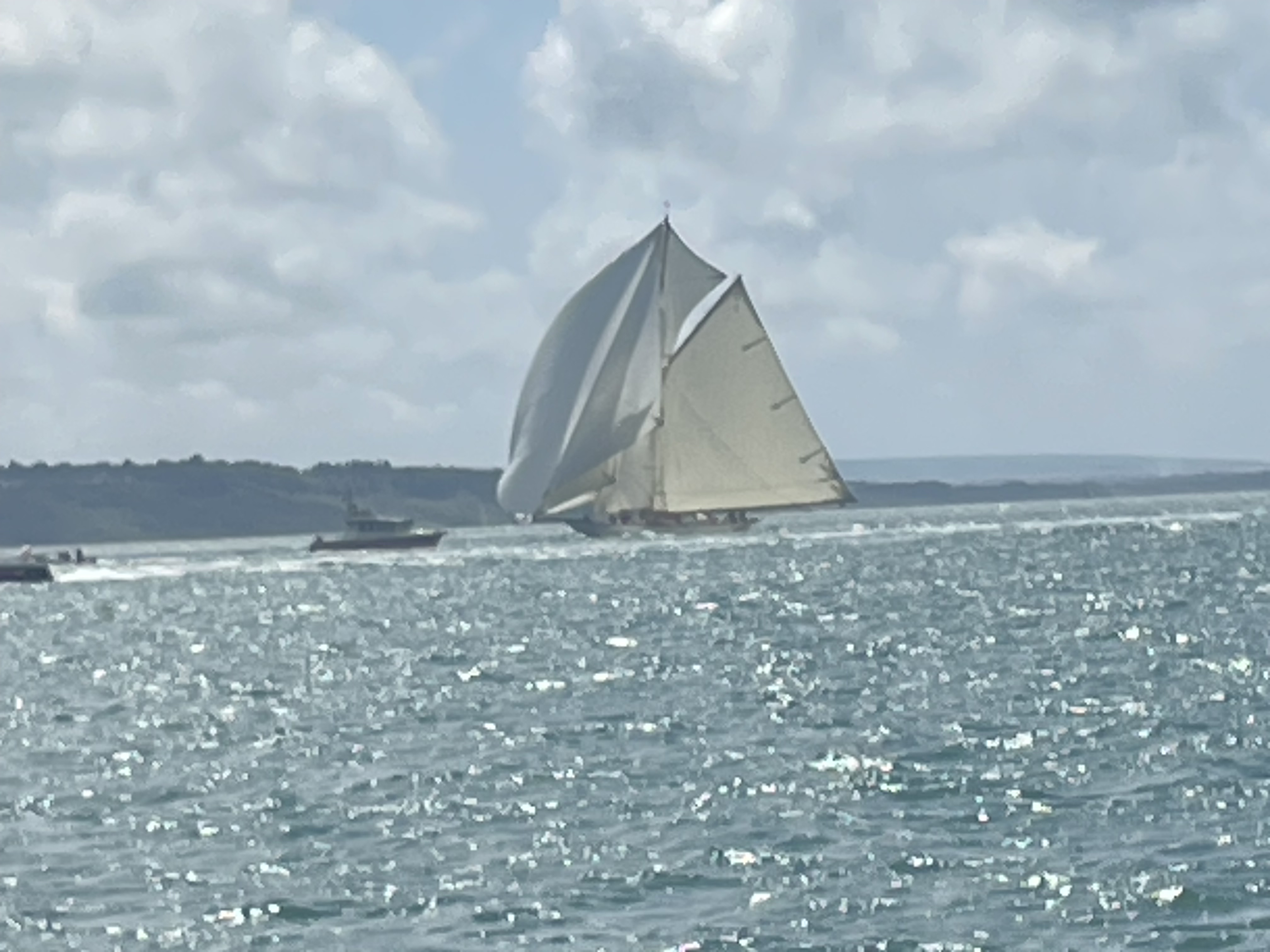 Not the best start to the day with a visit to the dentist for a rather deep filling. Despite injections this was not an entirely pain free event. However it was done by 0930 and with a slightly swollen and numb mouth I returned home to finish packing the car to go down to the boat. Surprisingly this would be Gillian’s first outing of the year having been able to avoid contact with water due to grandmother duties – which I agree are far more important than sailing. It was pretty gusty out on the water – it has felt as if it has ben windy all year even when the sun has been shining. I was conscious that Gillian would be a little nervous, so a reef was put in and we gently sailed on an easy tack to Newtown. Our timing coincided with Cowes Classic wek sailing and there were some magnificent sailing boats on the water which the photos fail to do justice.