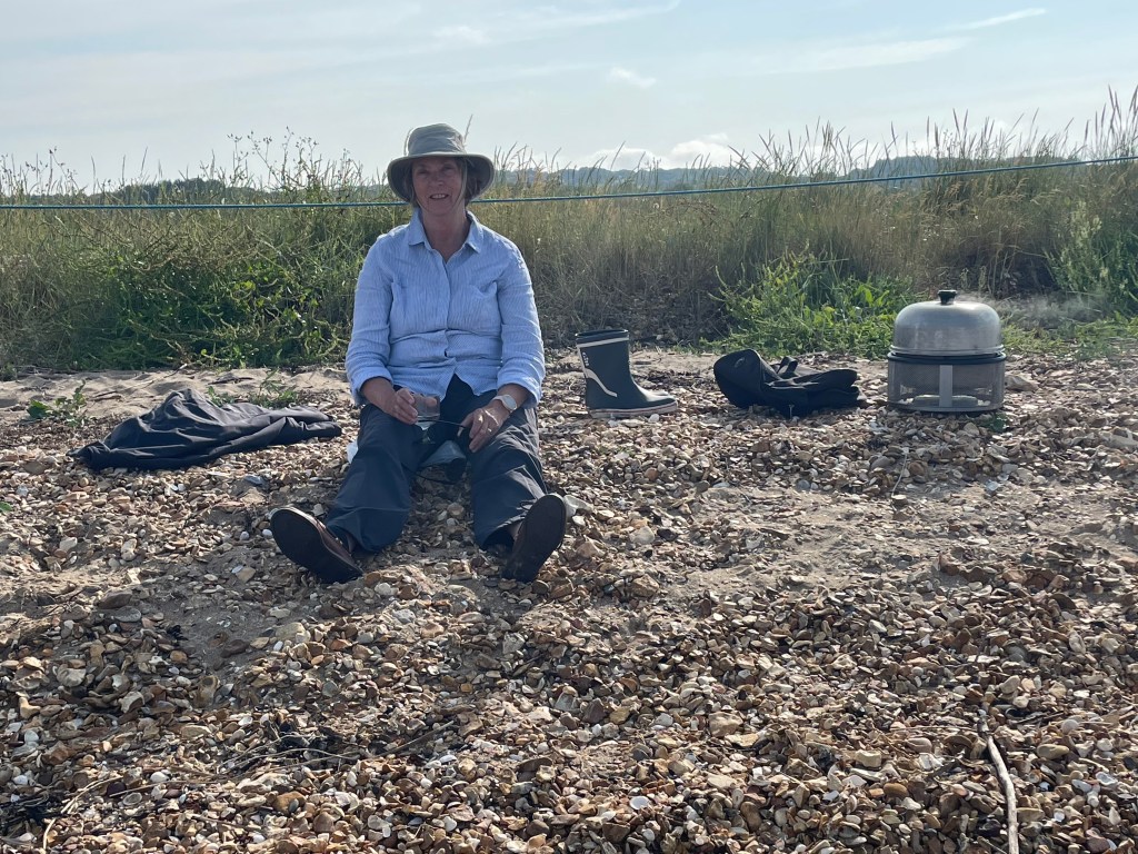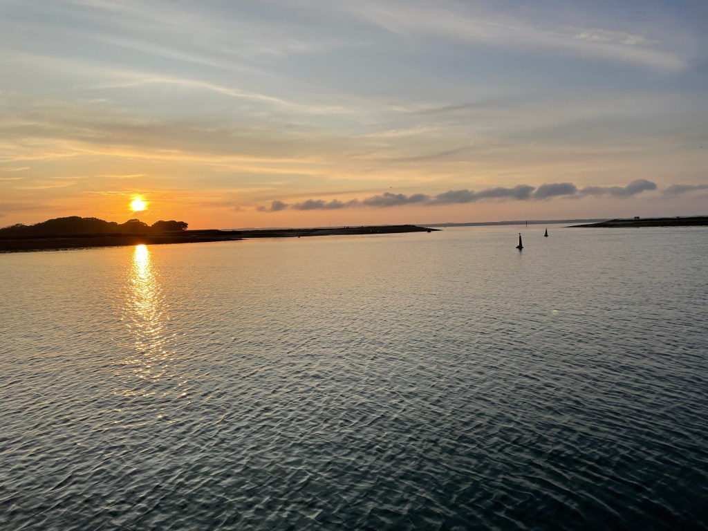Maggie had organised a BBQ on the beach to see the sun go down. The dinghy was loaded with the Cobb, drink, plates and cutlery – not forgetting the matches to light the BBQ – and we motored ashore with our reliable electric motor – which proved later in the story not to be that reliable! The wind had dropped and the crews from the 4 boats from RSrn (Rin Jinn – Maggie and Pat, Ninette – Paul and Anne plus guests Janet and Caroline, Hacienda – David and Judith and Purrfect Tale) gathered together overlooking the entrance to Newtown. The chilled white wine went well with the BBQ chicken wrapped in smocked streaky bacon and salad. There was a bit of a plaque of very small back creatures that no-one could quite identify but they seemed particularly attracted to Maggie’s bag!
