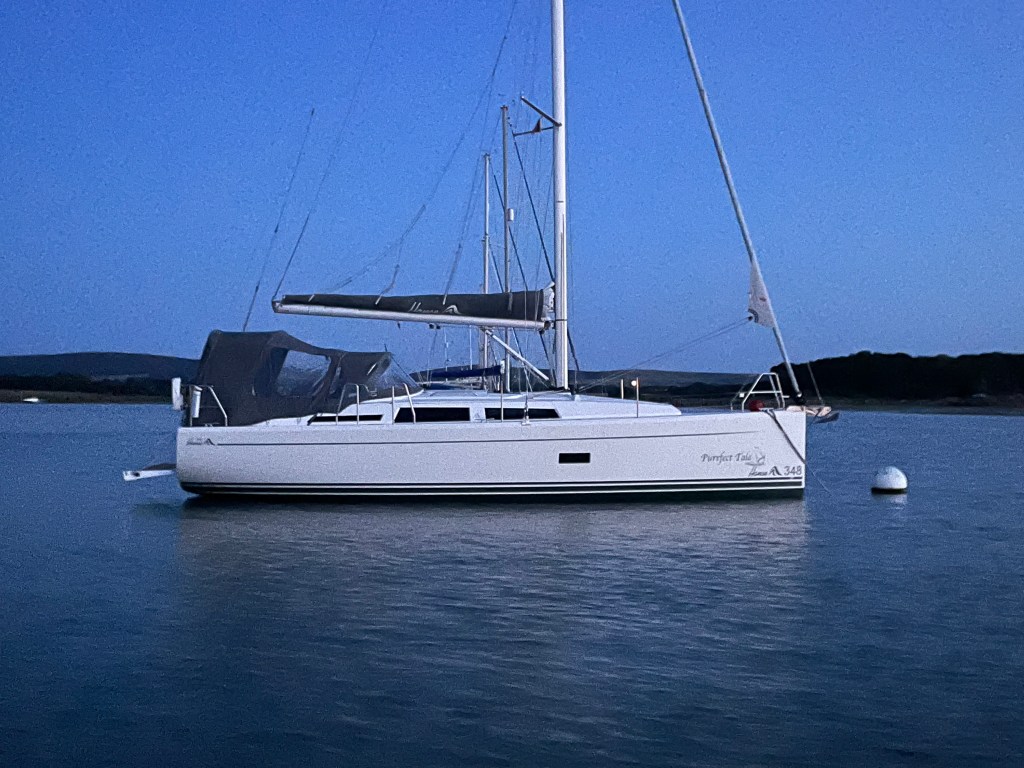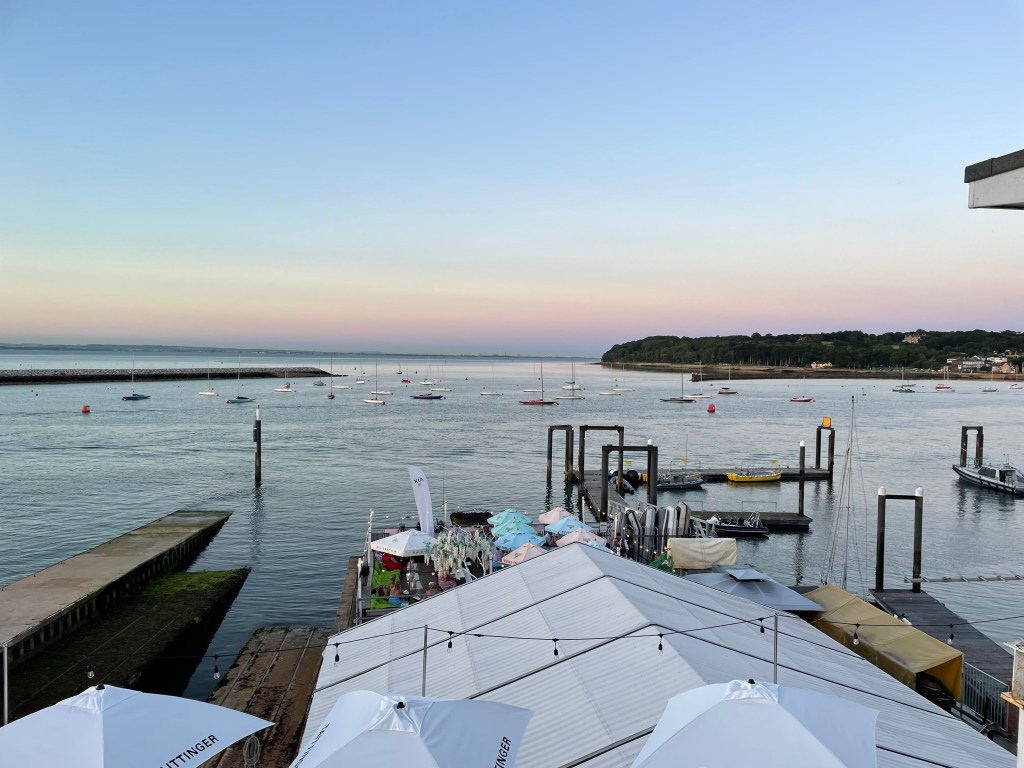 Supper was taken in the Island Sailing Club on the terrace. It was pretty packed with a wedding downstairs, members upstairs and our large party. Prior to dinner we found a couple of spare seats next to the owner of a Contessa 32 who had a excellent track record in the Round Island Race and was at the Club to return his trophy before the start of the 2023 race. There was clearly a great deal of mutual and tactile attraction with his fiancé at the table! For dinner we sat with Martyn who was a house builder based in Leicester, Mark Haines who was a senior renewable engineer plus another friend who was a car dealer. We had a very enjoyable evening swapping stories and experiences.