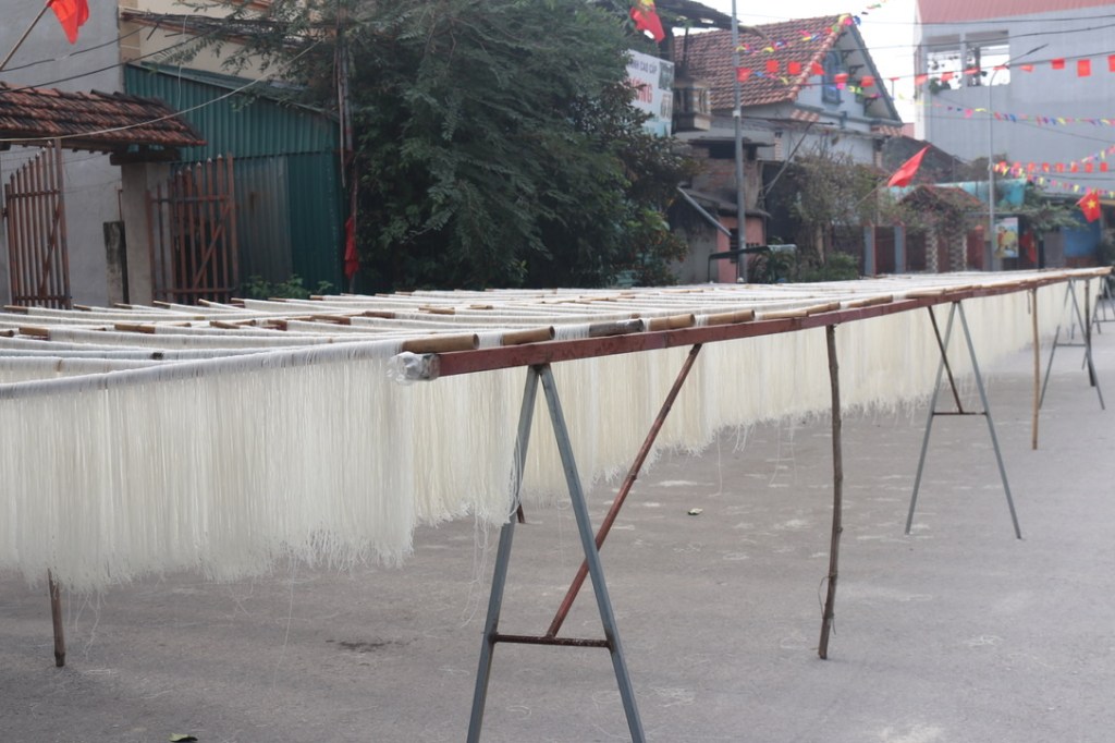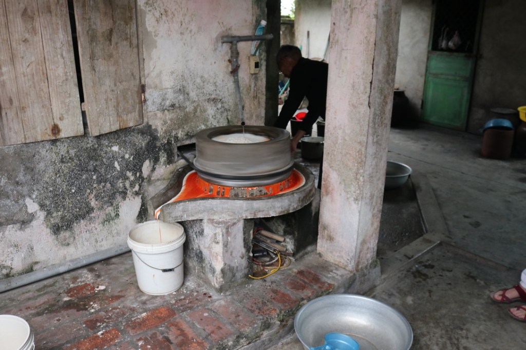 This area also produced large quantities of noodles. We could see them drying in the sun on wooden poles. We visited one of the small cottage industries that made them. Rice mixed with water and then pulled though a machine that created the long strands that were then put out to dry.