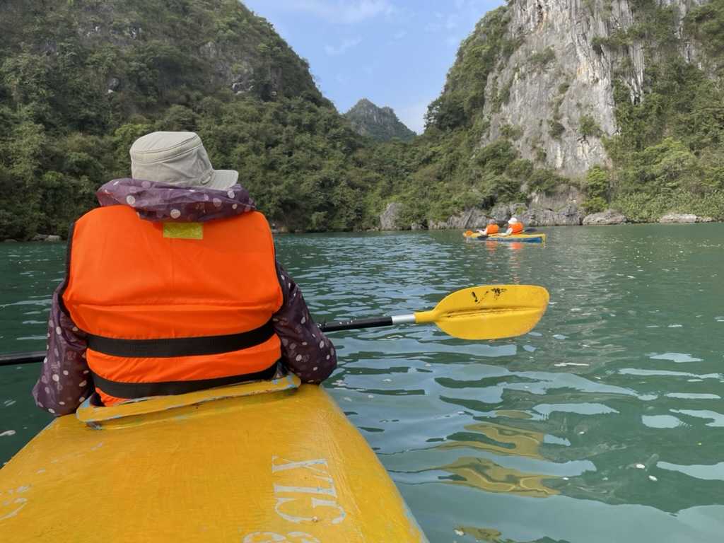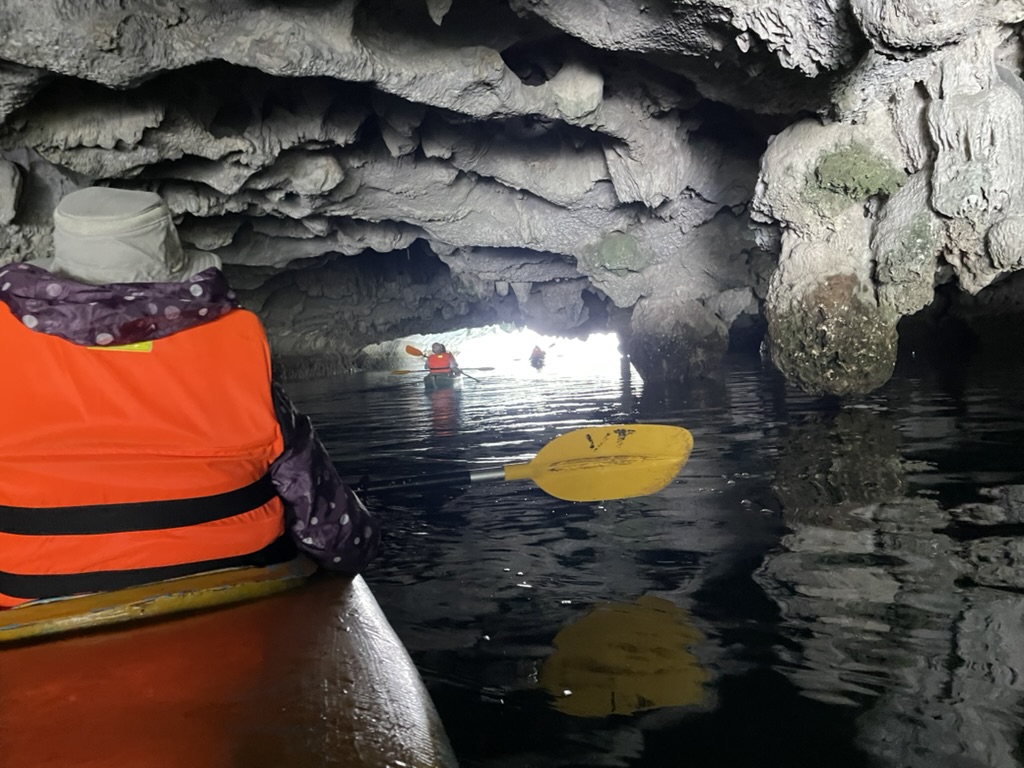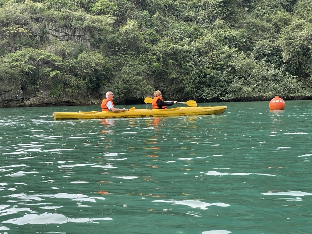 Gillian volunteered last night to do the Kayaking in the morning and she had not even drunk that much. As she lay in bed second thoughts came to her! But Gillian was determined to do it and not miss the opportunity. I got up early and enjoyed a quiet 30 mins on deck with a coffee before having breakfast. Gillian got up a little later and joined me on deck. Around 0900 the sand pans and kayaks came alongside the boat and we clambered in – Gillian in the front and myself on the back. They were very stable as we canoed away from the boat and towards the caves. On our right was a floating fish farm that was already attracting tourists. we went through a small cave/arch into an enclosed piece of water surrounded by the high limestone hills covered in jungle like vegetation. It was peaceful and we enjoyed the different perspective being low on the water provided. I had taken the iPhone for photos in the light weight waterproof jacket so every now and then we stopped to take some photos which we were convinced would not convey the majesty of the surroundings.
