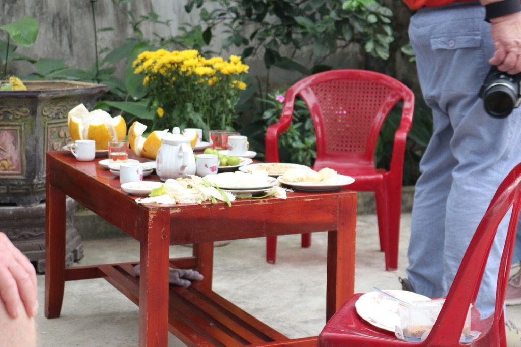 From the Village Meeting place we walked through narrow alleyways to an old house that had large stone jars in the courtyard in which they fermented rice. This seemed to be to make a sauce for serving with food but it might also have been used to create rice wine. The owner had been a soldier in the Vietnamese Army but because he was a catholic he was not eligible for promotion to any significant rank. We say in the main room of the house surrounded by photographs of his family and in front of the family shrine. We were served wonderful green tea in small cups with a fish decoration at the bottom. This was followed by brown rice wine – quite nice but at that time in the morning quite strong!