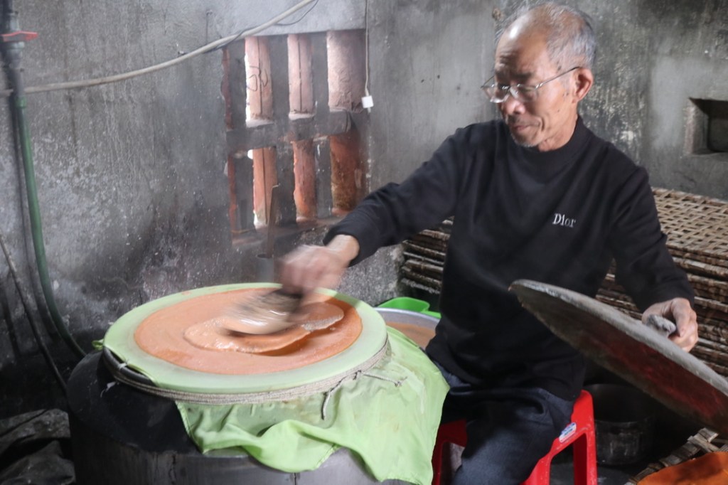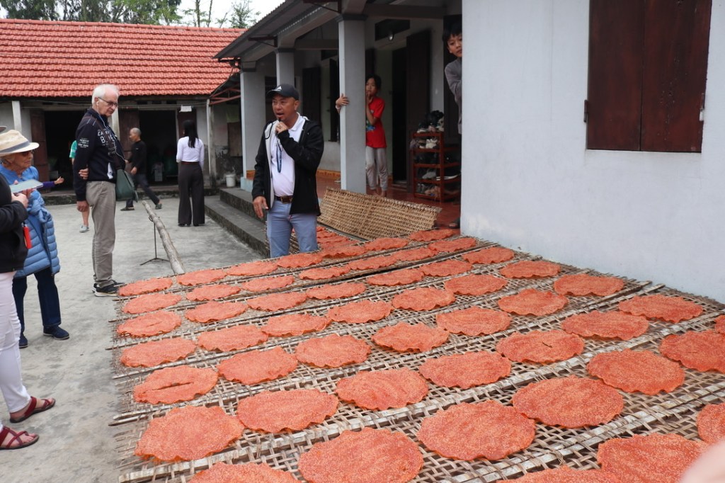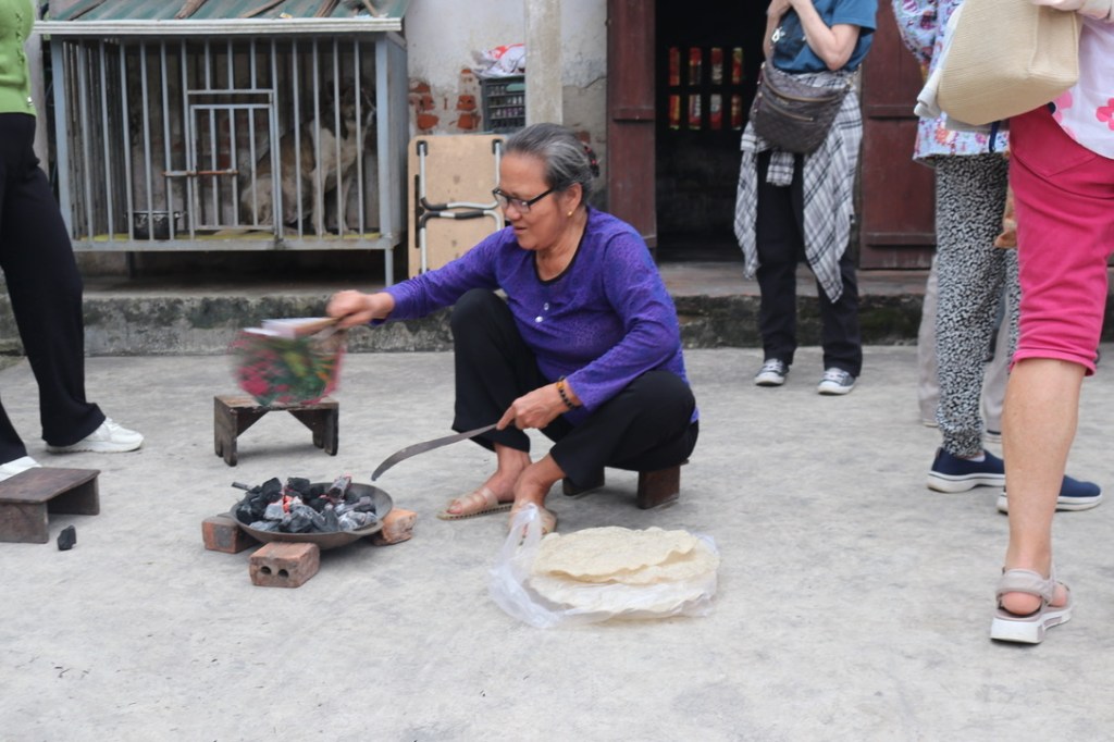 From there we visited a small home where they made rice crackers. There were 3 stages, mixing the rice with water and grinding on a mill stone – then to an oven where they were pressed and finally dried over a charcoal fire. They are eaten as a snack usually with Vietnam Wine which is not quite the wine we drink!