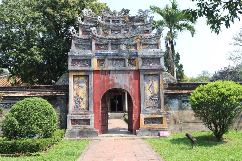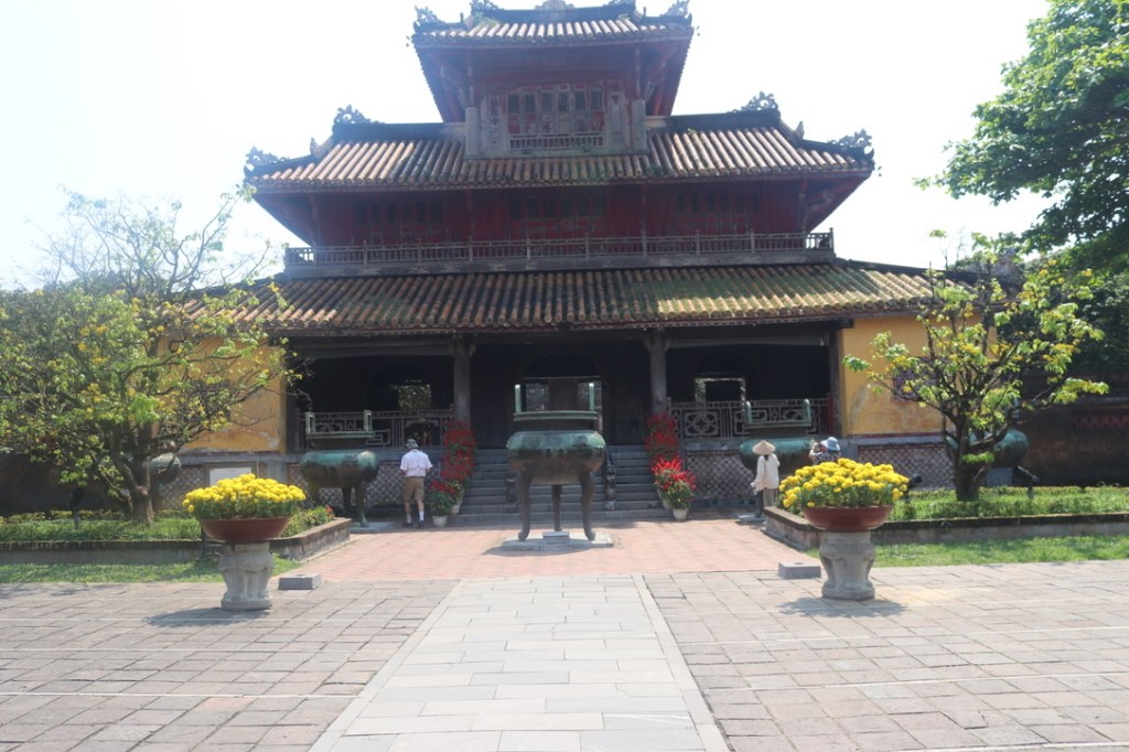 A nice late start at 0900 after a leisurely breakfast in the hotel. We both had a local speciality Bon Hue – I think – will check tomorrow morning! From the hotel we went to the Perfume River which was a 3 minute drive away and boarded one of the dragon boats – tourist boats – for a short trip up the Perfume River to the Thien Mu Pagoda. Although it was relatively early the temperature was beginning to rise as was the humidity. The river had a lovely background of the mountains at the head of the river. It was not spectacular but was enjoyable. There were a few steep steps up to the Pagoda. The story associated with the Pagoda is that an old woman appeared on the hill where it stands today. She told the villagers tat a lord would come and build a Buddhist temple for the country’s good fortune. Lord Nguyen Hong ordered its construction and named it after the old woman – Heavenly Fairy Lady Temple. Either side of the Pagoda is stele on the back of a huge turtle and on the other side a massive bronze bell. The turtle is one of the 4 revered animals – turtle, unicorn, dragon and phoenix. The Turtle represents long life. For those who have read Terry Practhets books you will recall that Disc World is held up by 4 elephants on the back of a large turtle that swims slowly through the universe. The gardens were beautiful inside the temple itself with the usual collection of amazing bonsai trees.