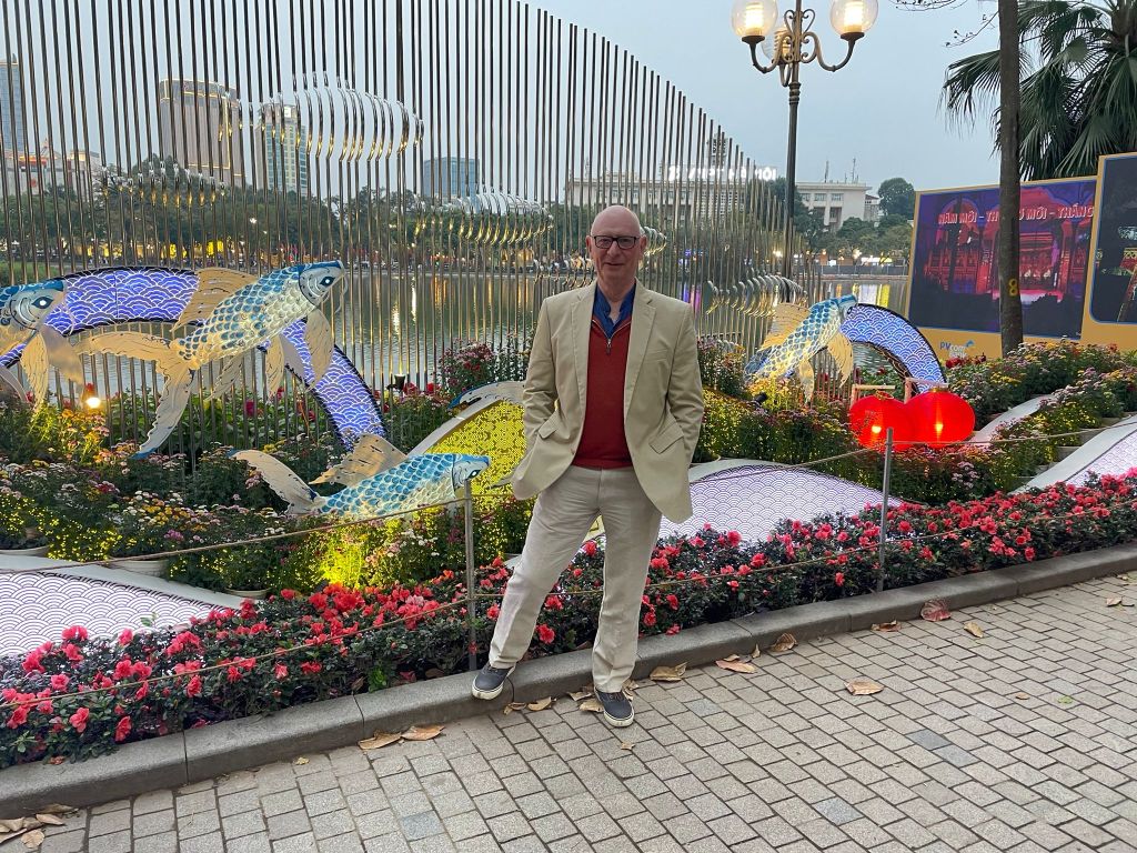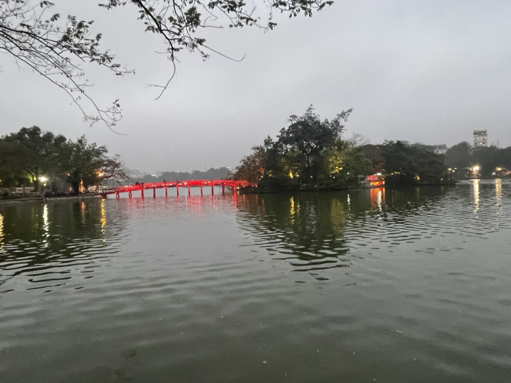 We unpacked and did give some thought to going for a walk but decided upon a short sleep first. In the early evening we walked around Horn Kiem Lake which borders the Old Quarter. We were still feeling a little disorientated and it took us some time to decide upon a restaurant. We changed some $ to Vietnam Dong – £1 – D25,000 and ate at the Lakeside View Restaurant. It was clearly set up for tourists with a menu that had pictures of the different dishes. Probably a little more expensive than eating very locally – but still great value at D575,000 – about £25 for 2 beers, cocktail, coke and main courses. Gillian had Pho – a N Vietnam noodles stem and I have what felt like a Vietnamese mezzi with noodles. Both were very enjoyable. Upon returning we booked in for drinks and eats on the rooftop of the hotel for Chinese New Years Eve which was on the 9th. Before taking the booking they insisted that we went upstairs to the rook top to choose our seats – despite it being closed and feeling quiet derelict! We are confident it will look better come Friday.