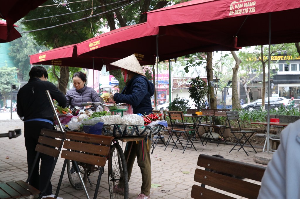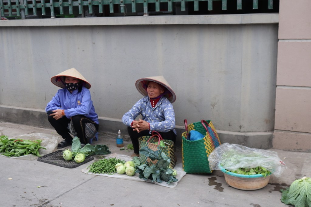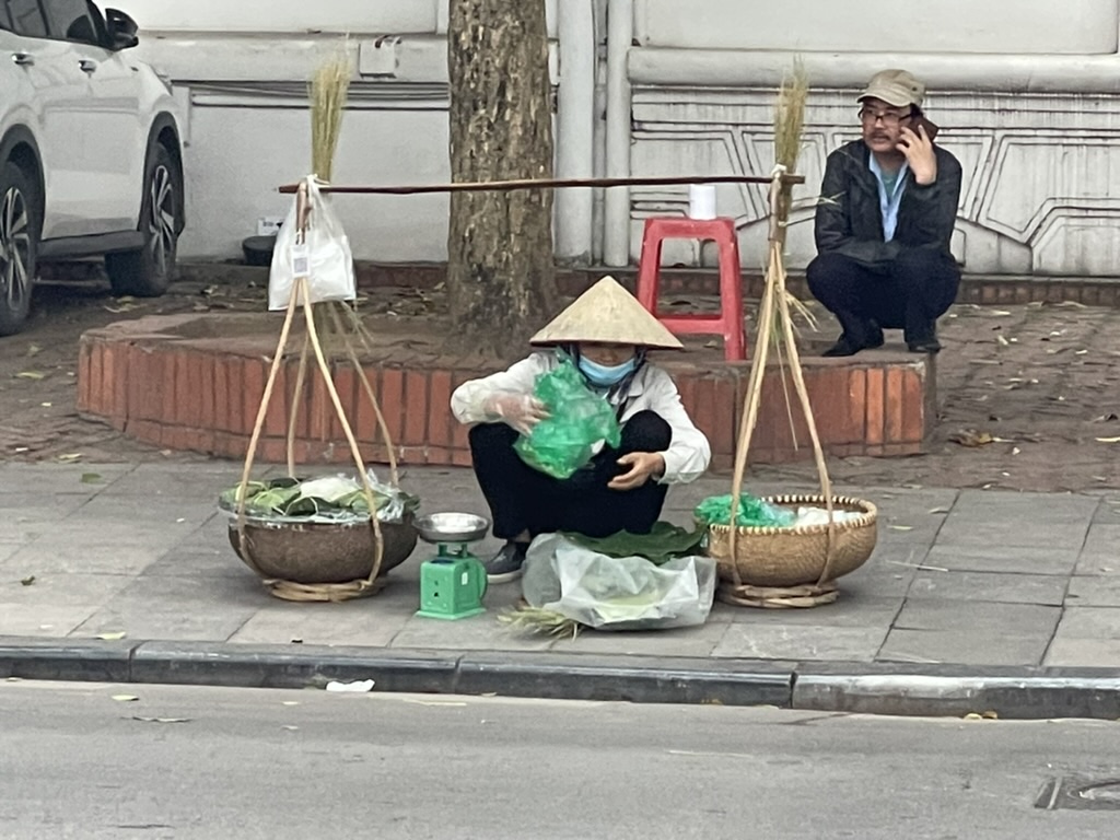 There is not much of the French Quarter left – the Indian Embassy is the best example. But it was a pleasant walk in coldish weather South of the hotel to Thien Huang Lake. It did take us some time to get used to the constant noise. It is hard to get away from. At the lake we stopped at a street side cafe – feeling brave – and ordering tea and a Hanoi Coffee for Gillian. Coffee here is extremely strong and as there is not much fresh milk it comes with condensed milk – very sweet. The tea and coffee are served with perfumed water. As your teapot begins to run out they come around with a vacuum flask of hot water and top up. Whilst sitting at the cafe a woman came around selling fresh vegetables and herbs on a bicycle. The owner came out and individually picked items to be weighed.