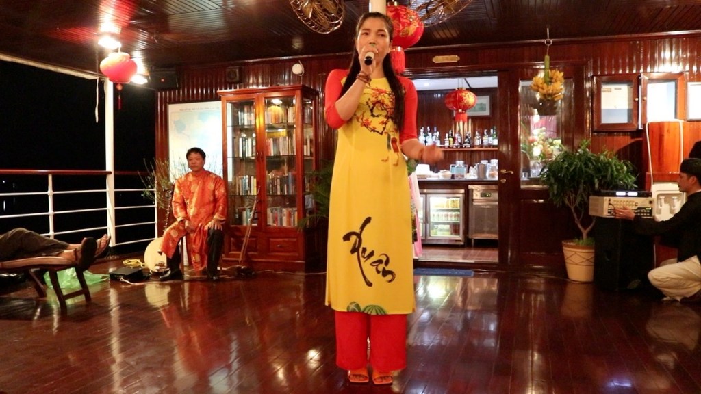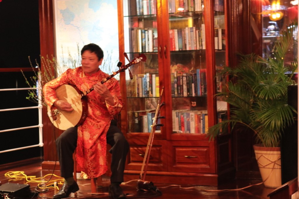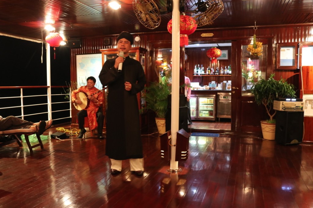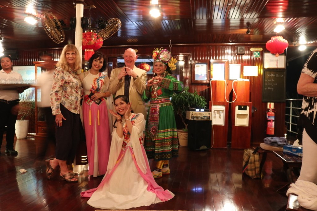 In the evening we caught a taxi into town. It was a lunar night and downtown had all of the lanterns out on the streets. We stopped and had a iced caramel coffee in one of the shops and as we wandered back to find a taxi we bought two sausages on a stick – not sure what they are called. I had mine dipped in chilli – a lovely light evening snack. We were aware that that night the hotel was hosting a dinner for the managers of all the other hotels – a sort of New Year business celebration. The Vietnamese seem to love karaoke. Many got on the stage to strut their stuff whilst others posed for photos. We sad and supped a carafe of wine as n exorbitant price – but after our spending spree at the tailor’s it felt quite cheap!