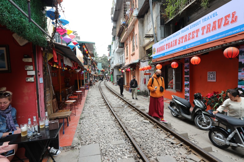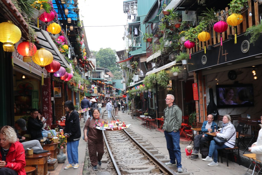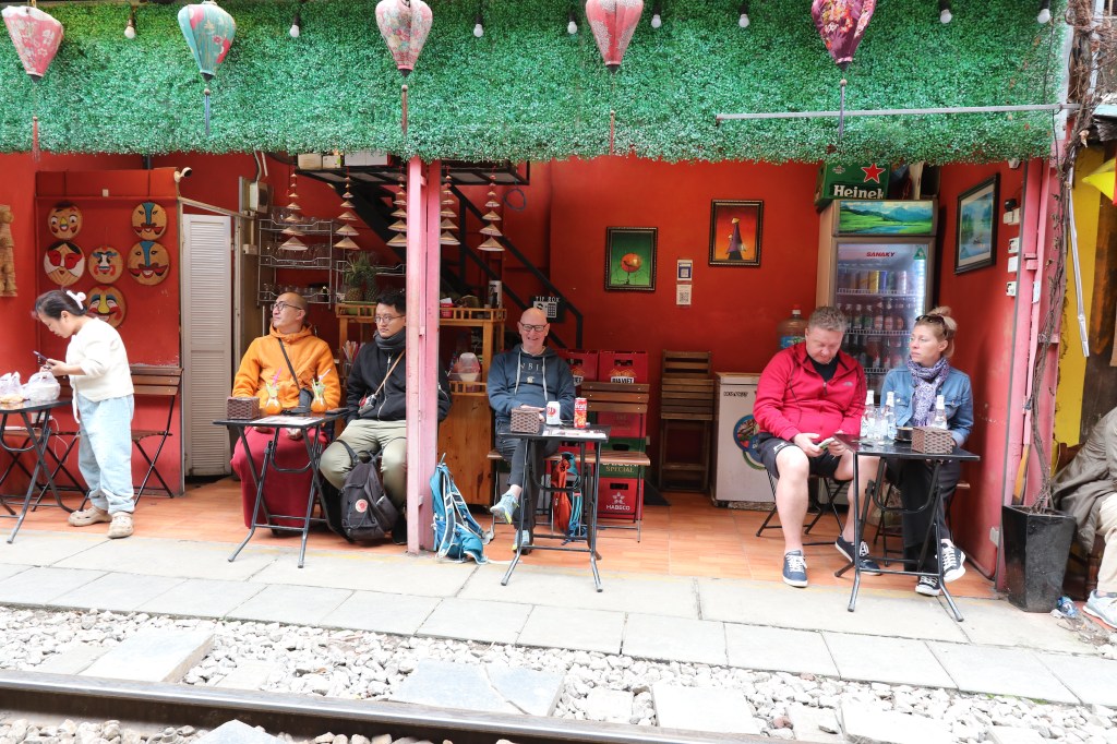 We then fought our way across streets full of motorcycles to Railway Street. The authorities at one time tried to close it but there was a howl of protest from the cafe owners who made a living from the tourists who came there. We stopped for a drink and to watch life wander by! The owner has lived for 20 years in Soho and had recently moved back to Hanoi – not as expensive as London she stated! We found the people extremely friendly and helpful.