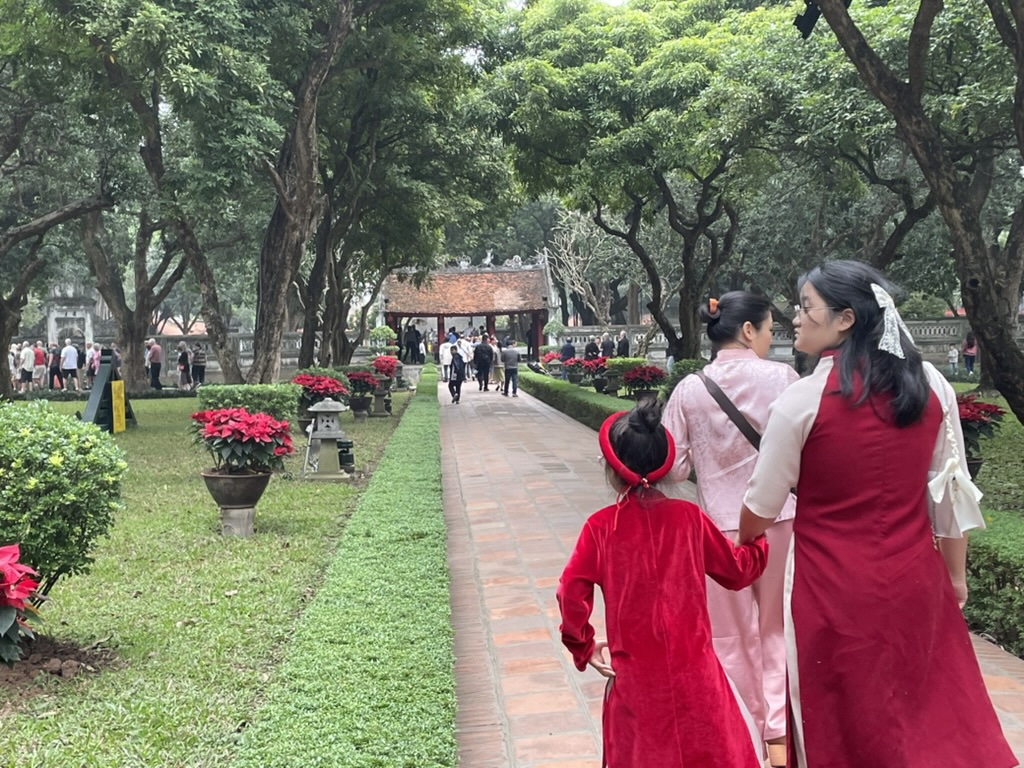 First stop was the Temple of Literature in the French Quarter. A bus took us across town – an adventure in itself – navigating the narrow streets, cars and motorcycles. A fascinating place that dates back to 11th century and was the home in Vietnam to Confucius thinking. It was Vietnam’s first university from 1076 to 1779. There are a number of courtyards and inside the 2nd one there are ‘turtle stelae. These are stones slabs – a bit like a tombstones – mounted on a turtle. It took us a while to understand what they were – they are as Gillian put it – the very first yearbook – names of those that had passed the exams. These individuals went on to become regional administrators and advisers to the Emperors.