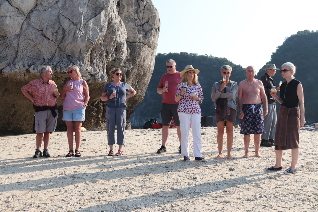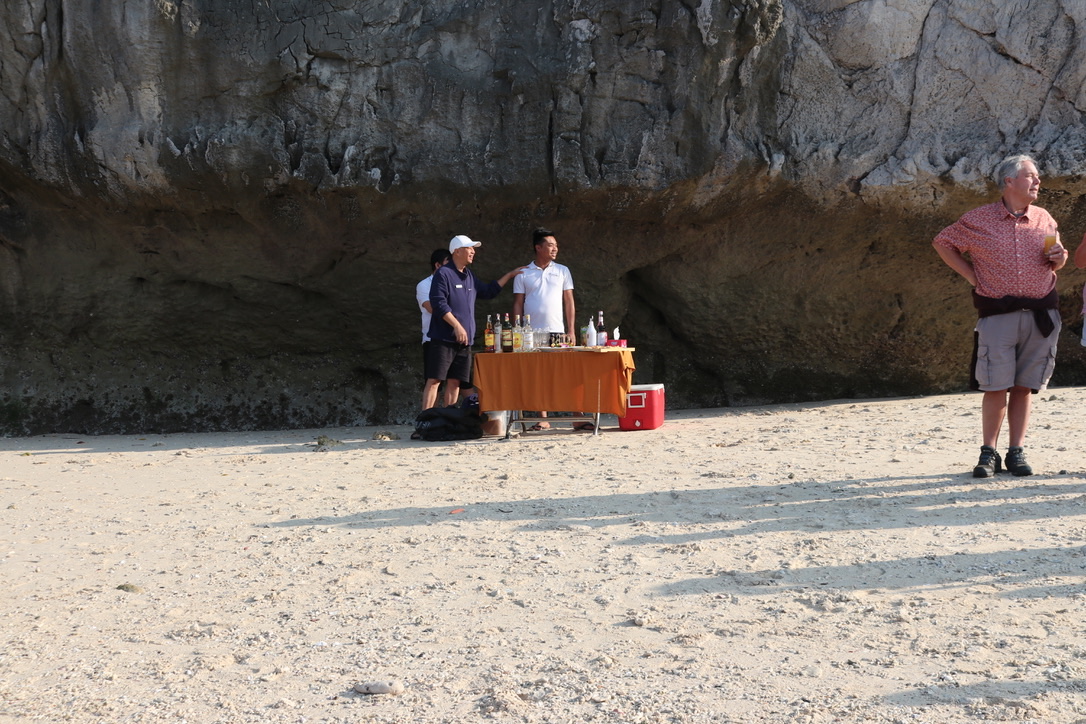 After lunch we visited a floating fishing village – again set up for tourism rather than ‘real’. But it was impressive. Fish were mainly grouper , some tuna and some bass like fish. They were being bred for high quality DNA and to release at a later date into the wild. In order to move around the fish farm you had to walk across planks of wood between the different nets. The guide mentioned that they had made the planks wider in respect of our age! Mid-afternoon we went to a beach – chairs and cocktail bar set up. A larger group of younger people were there playing volleyball.