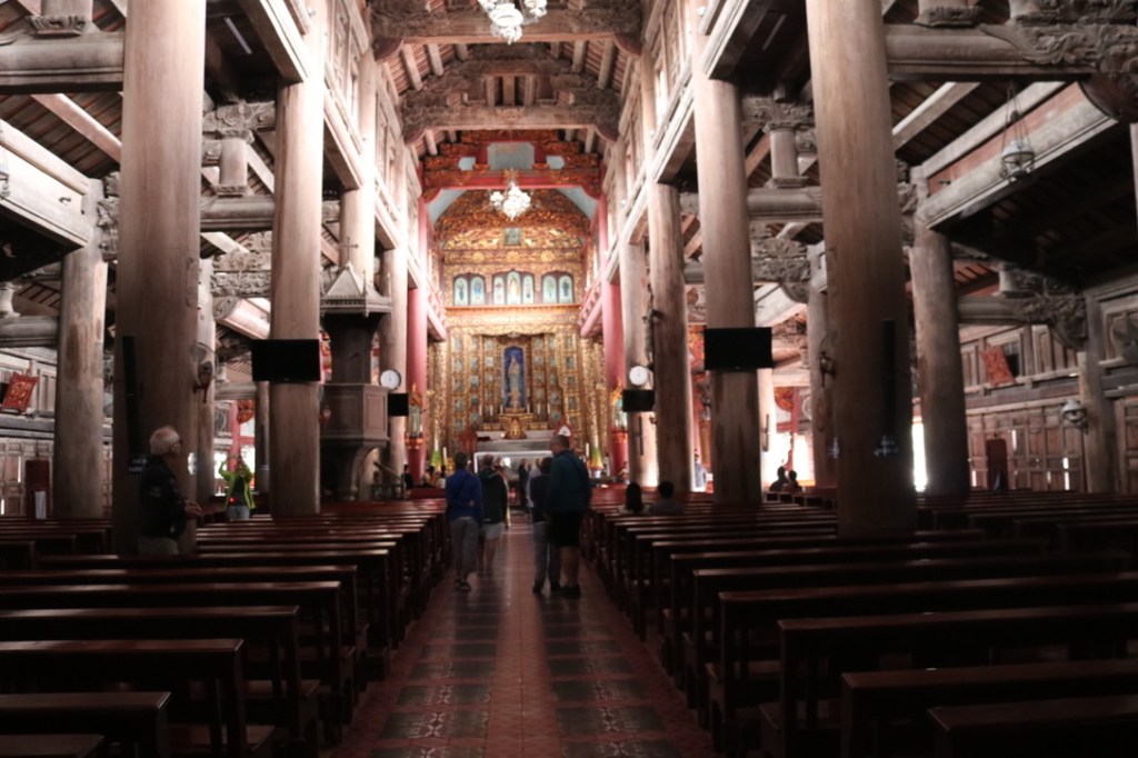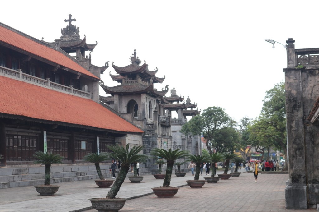 This morning we travelled by bus to the town of Phat Diem which is the site of the oldest catholic church in Vietnam – completed in 1891. It is a large complex that is a mixture of Buddhist and Catholic architecture. The inside comprises huge columns of iron wood pillars. At the end of the 1st Indo-China war as it is sometimes referred to in Vietnam, many of the catholics moved south to escape the communist government. They had a window of 300 days from the signing of the Geneva Accord to move freely between North and South. This migration increased when the Communists took full control of the country. It is very popular with Vietnamese tourists who travel from the South to the North to visit families and worship at the oldest church.