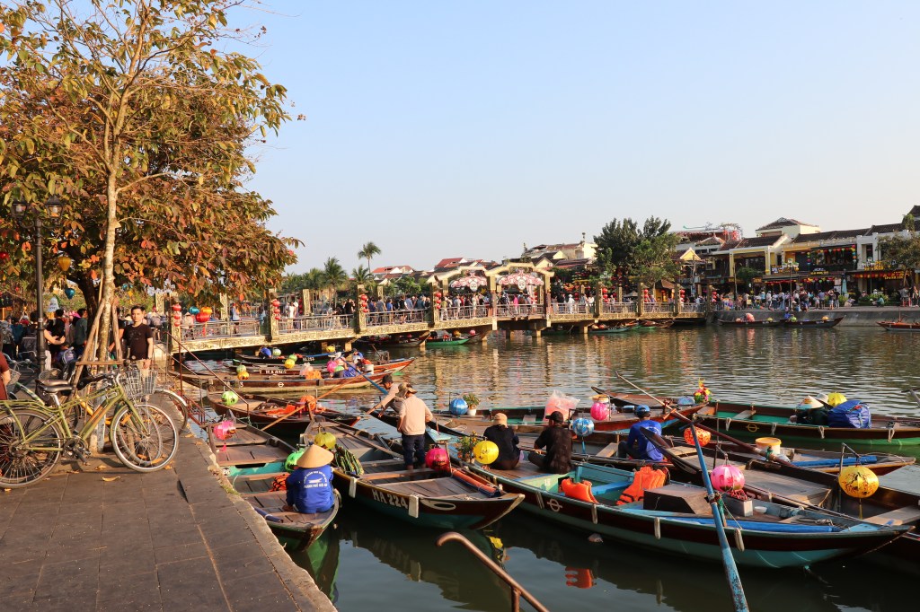We thought we were now coming to the end of the day but we still had the tour of the old town to complete – street market, two temples, Heritage House and riverside. We also stopped where there was an old bridge between the Chinese and Japanese part of the old town. It was under restoration and the guide – Tuan – was not confident it would be done well! It was beautiful and there was a lot of Chinese influence – but we were here in the high season.