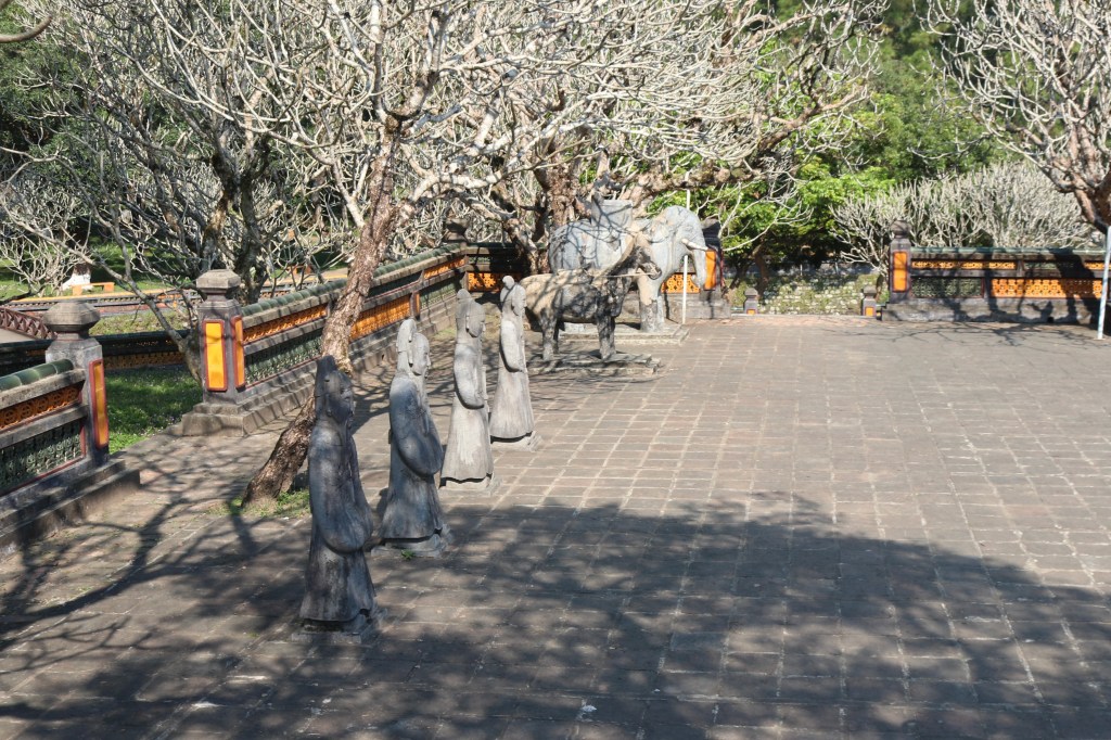 In the afternoon we were feeling a little weary from the heat and humidity but made it to Tu Doc tomb. He was the 4th Emperor and designed and built his own tomb. It is set in a magnificent set of grounds. Near the tomb is a large stone stele that took 4 years to bring from the north and is inscribed with the King’s own words. He stated that he had 3 problems – he was a second son as the previous King would not agree to his first sone being King, as a result of an illness he was unable to produce children and lastly he was unable to protect the people as he reigned when the French colonised the country. He was the longest reigning King and seems to have been very popular despite his self criticism. One cannot fault him for trying – his concubine was 103 wives. Tuan mentioned that the King’s body is not in the tomb. It was a tradition that their actual burial place was secret and the men who carried him to the final resting place killed themselves as an act of self sacrifice. The secrecy was required as when the King was buried his tomb contained many valuable to help him in the next life.
