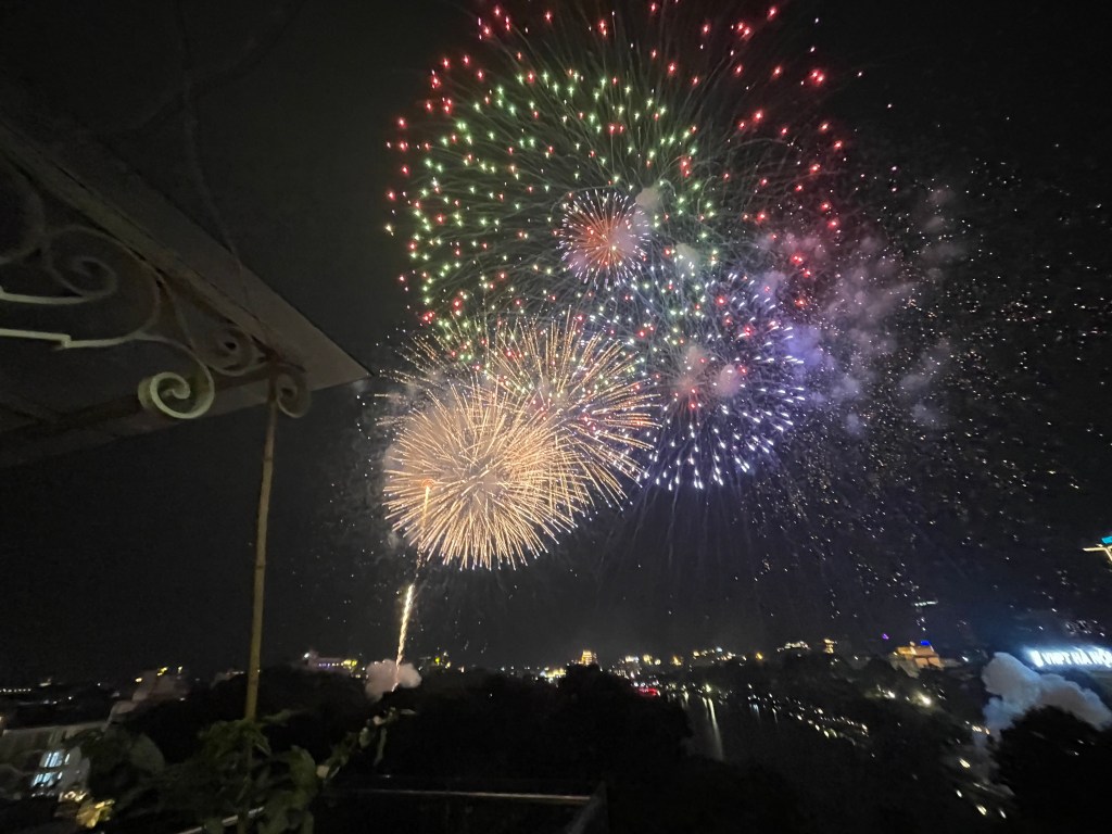 After the meal we returned to the hotel where they had arranged tables on the roof for guest to watch the fireworks. There was one large table I think of Chinese and next to us a family of 3 from Hanoi. Food was served from the patisserie next door and we shared a bottle of wine. The view was perfect – across the lake – with the fireworks exploding directly above our head. A huge display that went on for at least 20 minutes. There were crowds and music around the lake and there was very much a celebratory atmosphere.
