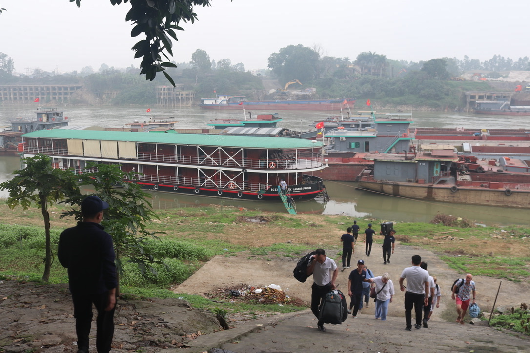 A packed day again. Up at 0630 to pack. We were concerned that we might struggle to get all of our stuff into the bags – but it worked out. Gillian hand carried the vase and the ‘bells’ we got from the hotel in Hanoi for New Year. Docking the boat was chaotic – definitely extreme rafting – we the skipper manoeuvred the ship in between multiple barges who had to move to make room for us. It took him around 40 mins to get us in. The Lo River which flows from China was fill of commercial traffic – mainly barges collecting sand for construction. It all seemed to be conducted with a good sense of humour and helpfulness.