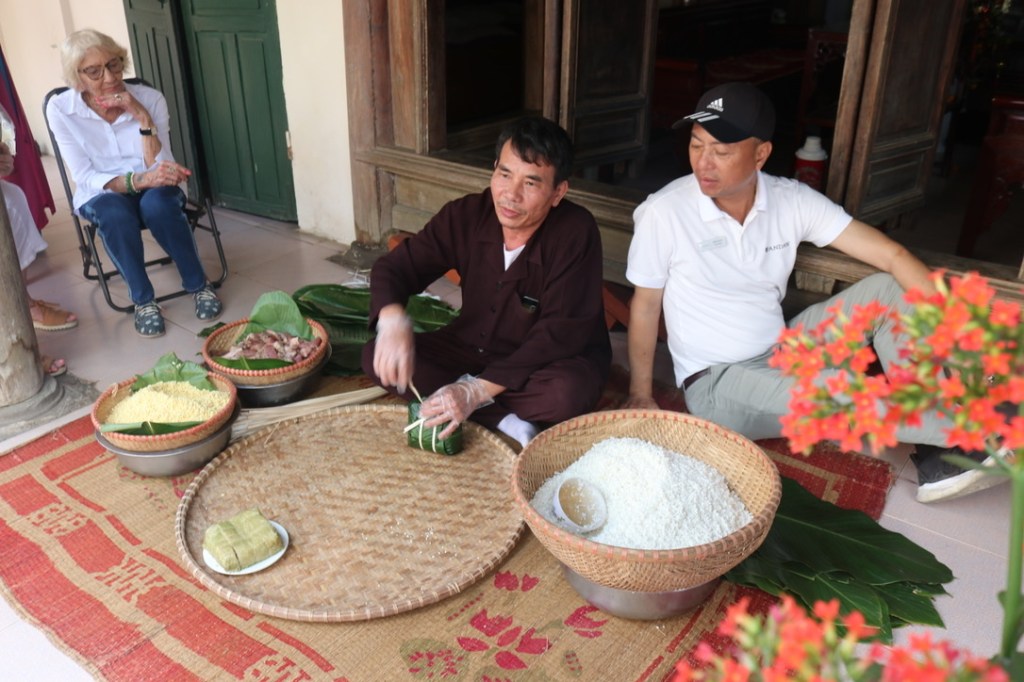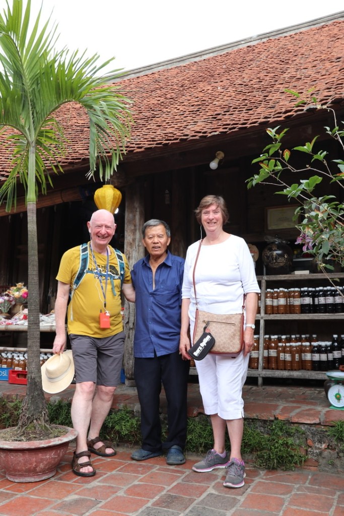 Even though we were beginning to feel a little jaded the village we went to first was quite inspirational. The Hung Lo Temple was built in the 17th century and is dedicated to 3 royal lords – At Sun High Lord, Vien Son High Lord and Ap Dao Quan High Lord. We were treated to a traditional dance and songs by members of the village who keep and pass on the traditions of their forebears. The instruments were basic – a drum and bamboo sticks. One of the dances reflected the work of the men and women in the rice fields and the final one was fishing in the Lo River. For this dance the women acted as the net and the men as the fishes. We were all invited to join in. A simple dance that we could all pick and follow the movements easily! After the dance we were served rice wine in a greeting ceremony.