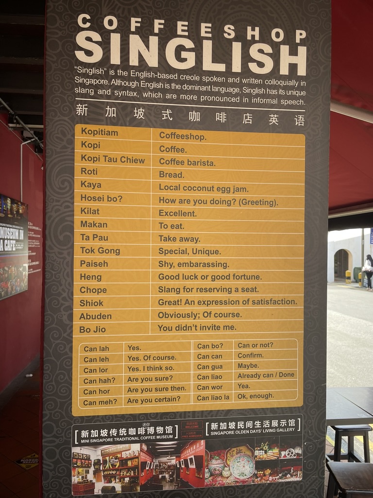 Outside one of the coffee shops Michelle introduced us to Singlish – a sort of pigeon english which is commonly used – and most understand.