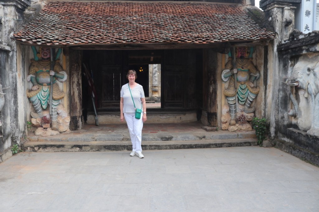 We then travelled on by bus to the Tay Phoung pagoda. This was set atop a hill – the guidebook describes it as a hillock – Gillian would take exception to this as there were around 350-400 steps to get to the top. It was even more popular than than first. The road leading to the pagoda as well as the area immediately around the pagoda was full of shops selling mainly food and drink and sellers of trinkets from mayflowers to beads to little wooden key-rings that illustrated your year of birth in the Buddhist calendar. The climb up to the top was not too challenging. Halfway up I was stopped by 3 women who were selling food for a photograph. As is common it was not a stop and snap but a stop, pose, snap, look, pose snap and eventually content with the picture hands were shaken and I was able to catch up with Gillian. At the top was the pagoda complex – it was not as impressive as Thay pagoda but was nevertheless worth the climb. The carvings were from jackfruit wood and dated from 18th century