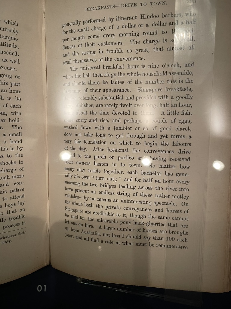 As we walked into the main area of the museum, Gillian needed an ‘ease springs’ moment. This was where the morning went badly! Unknown to us we were at an exit point where there was a toilet. Instead Gillian walked all the way back through the exhibits we had passed to find somewhere. This took some time. I found a seat and patiently waited………..1hr! Gillian could not find her way back and I was afraid of moving in case we missed each other. After 1.5hrs we did find each other as I came out of the main floor to see Gillian waiting at the exit. However we were sufficiently chilled out on this holiday that we walked back through the museum together. We found the whole place absorbing – from pre trading port, through to its establishment and onto its occupation and independence. An exert from one of the Mems memoirs was quite evocative. Interestingly the start of the day in Singapore has not changed much with work rarely commencing prior to 0900-0930.