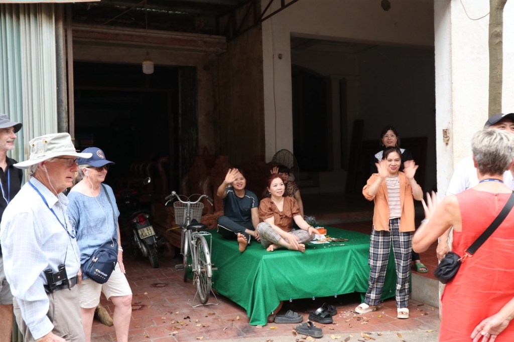 We then travelled inside the dyke – there was a clear definition between those that lived inside and outside of the dyke. In this village they made furniture. The wood was not from Vietnam but brought in from Laos and S Africa. we did think there was some irony in Vietnam conserving its forest but happy to rape and pillage Laos! The furniture was impressive and huge. Certainly too large for any house we had lived in. It was still the Tet holiday so not many of the workshops were open. We past a group of women sitting on a table chatting and eating nibbles. In the corner of their workshop was a wooden frog which they made and was meant to bring good fortune to a house. When the guide asked the women about the frog they said they made tow – one for the honest official and one for the corrupt official. For the corrupt official you could put a gold coin in the mouth before giving it to him!