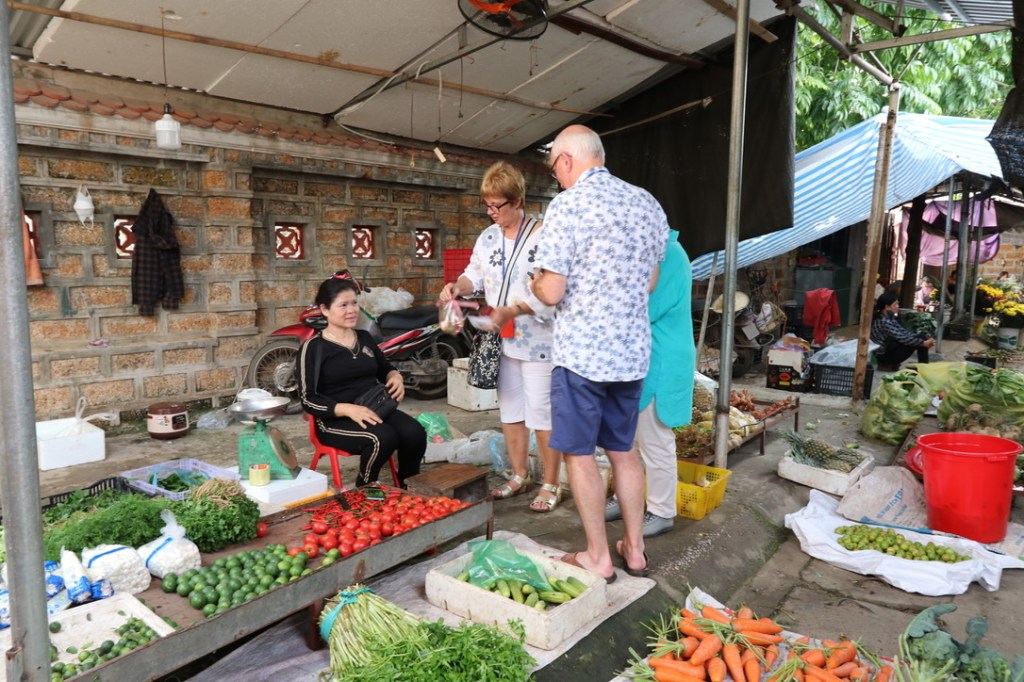 This morning we visited the last market of the tour! A small competition was organised and the group divided into teams. Our task was to buy 5 items and all we were told was the Vietnamese pronunciation: urt, hang, toy, gunn and chang. We were given 20,000VD and guessed they must be vegetables of some description. The first stall holder we approached had absolutely no idea what we were asking. However the 2nd not only seemed to understand us but also seemed to decipher what we wanted from our small handwritten note. We negotiated a price of 10,000VD and returned triumphantly back to hand over our results. A nice gesture was to return to the seller and hand them the remaining 10,000VD as a tip/thank you.