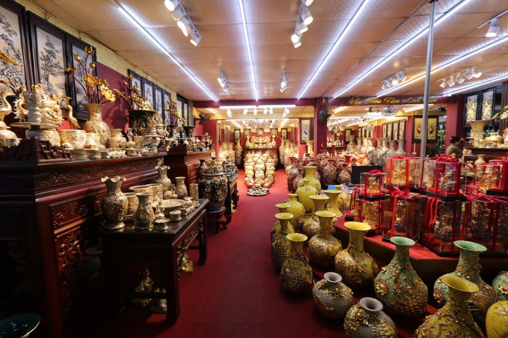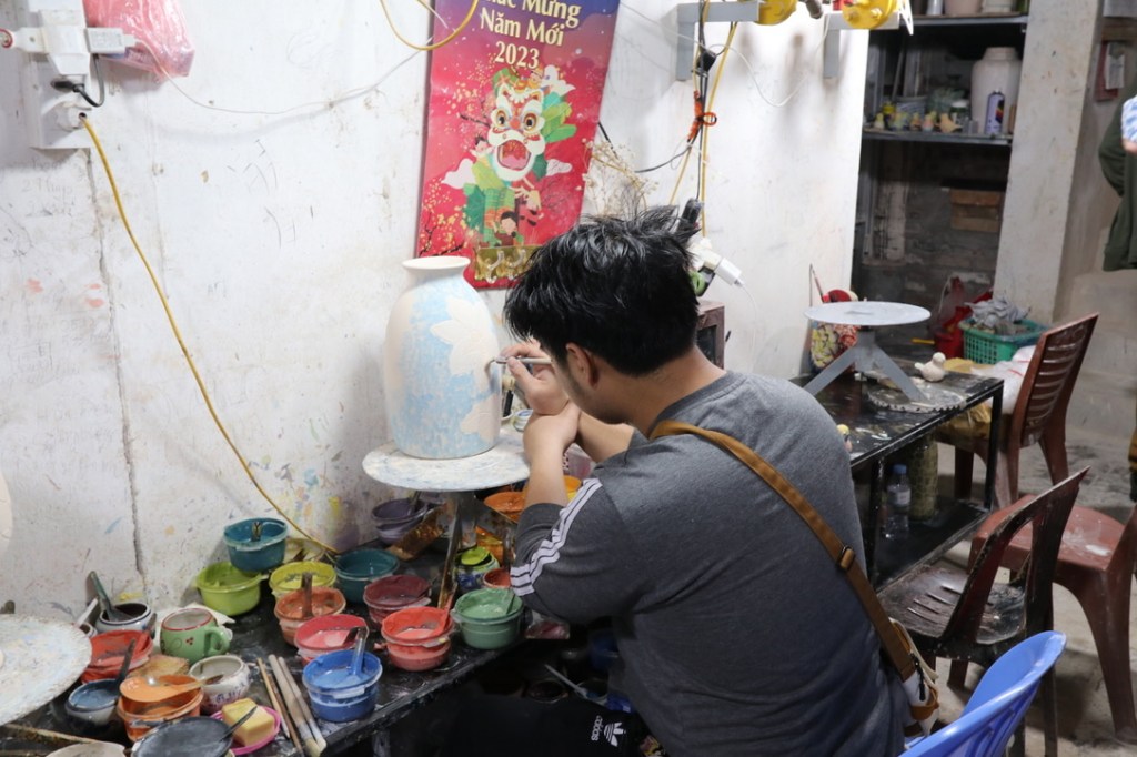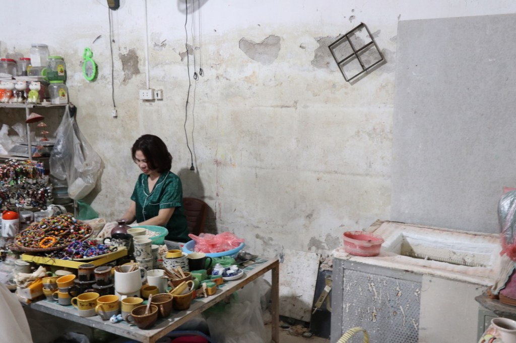 The entire village is focused on producing pottery and ceramics. From early days of local production it is now a high volume producer for retail outlets such as John Lewis. There are lots of inter-connecting alleyways that lead past workshops and homes. The local source of clay has now been exhausted and all has to be imported from nearby areas. Similar to much that we have seen in Vietnam there is a ‘man in the loop’ on all processes. Hand produced and painted and placed into gas or electric fired ovens.