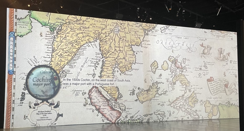 Our last day in Singapore but we were determined to make the most of it. Neil and Carisa had recommended the National Museum of Singapore which was near Fort Canning. We braved the subway and walked across the road to the museum for breakfast before looking around. What strikes you about Singapore is how green it is, how many trees there are and the pride people take in them. Breakfast was in the Seniors and Family cafe which was staffed by seniors and those with physical or autistic symptoms. A lovely setting and far better breakfast than in the hotel at a fraction of the cost. We started at the top of the museum and walked down beside an animated projection of Singapore jungle – wildlife, trees, animals. As we came out of the bottom of the display there was an exhibition of photographs of 16 pictures of individual trees. This was inspirational. They told a story of people and the environment and what it had meant to them.