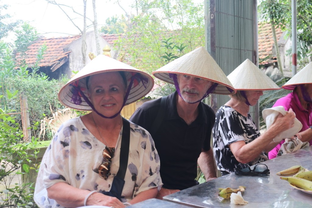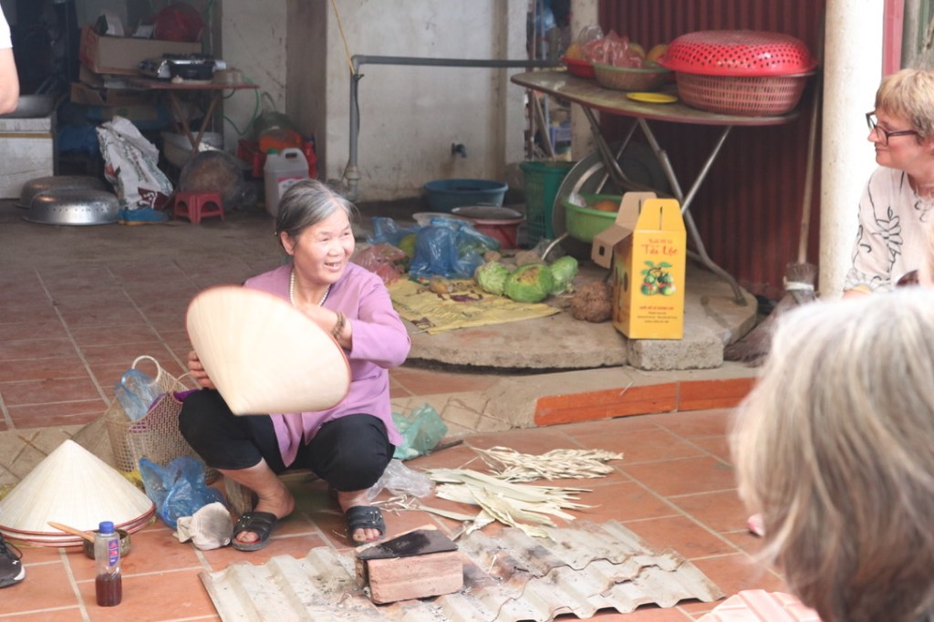 From there we travelled to the conical village where they made the traditional hats. Another fascinating visit. It took 1 day to make one hat. They started off with a frame upon which they laid multiple layers of palm leaves and then added a ‘chin strap’ to keep the hat on and then lacquered. The women sat around in a group chatting and making jokes as they each constructed a different part of the hat. The ‘working’ conicals are made from palm leaf and the ‘fashion’ conicals are made from bamboo. The life expectancy of a working conical was around 2-3 years in all weathers. They are widely used and a very common site not just in the fields but around town. The shape also lends itself to being used as a basket. We were each presented with one and then sat down for tea, bananas and peanuts. We were introduced to halving the bananas and adding a peanut to the top before biting off. Each of the hats had been made specially for us and were were all asked to take it away. For those that could not ‘import’ when they returned home, the guide collected and would hand out on his next visit to the villages.
