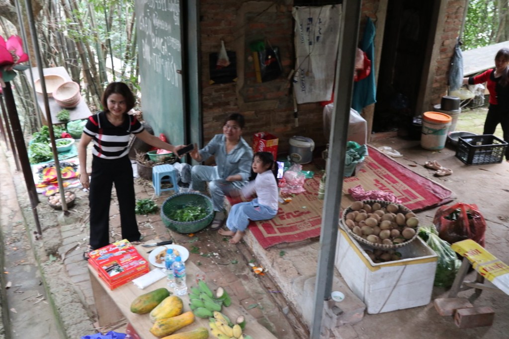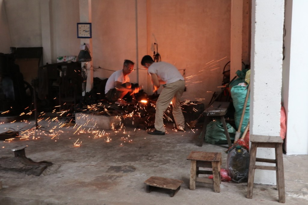 In the afternoon the river ferry came out to pick us up and transfer us to shore as we were moored in mid-river. Ly Nhan village is a blacksmith village in many ways along the lines of cottage industries. The first stop was a woman making handles for knives and scythe. The noise was horrendous but no ear defenders in sight. She was paid per number of handles produced and she was reluctant to slow down to speak with us. From there we walked to the blacksmiths shop which was effectively in their house courtyard. It was a family affair – the father and son acting as blacksmiths and the daughter helping to hammer out the metal from the coal fire where it had been heated. She also seemed to be the ‘marketing manager’. A small joke was made that the family of the girl are happy if she is born strong as it is easier to find a husband in the village! The iron was mixed with a small piece of steel and heated. It was then hammered flat by hand and reheated before moving to a large machine which thumped out the knife shape. Some more heating and then sharpening. It was impressive to see them work and the cost of the large knives was small for the effort that had gone into them – around 200,00VD – £9. Gillian chose one for the kitchen which we hope we can get back into UK!