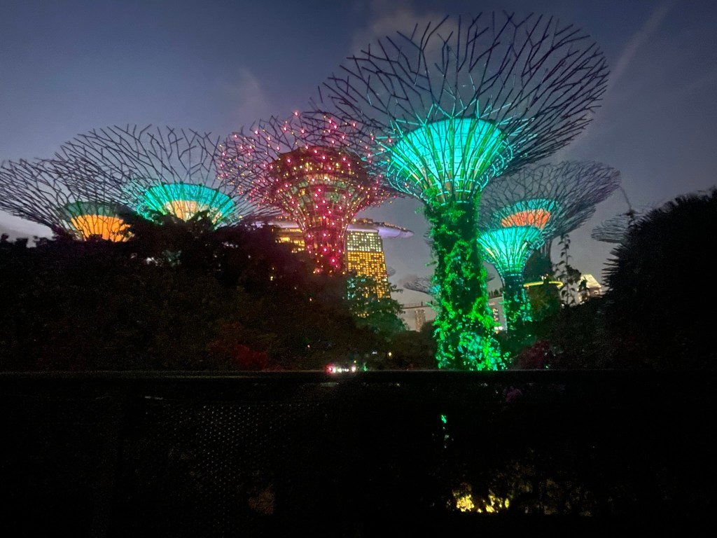 In the evening Neil picked us up and after a drive around some of the highlights we had missed, including the Raffles Hotel we headed across to Gardens by the Bay which was overlooked by a THE casino – two large buildings connected a ‘boat’ which is an infinity pool at the top. The Gardens by the Bay is a nature park spanning 101 hectares in the Central Region of Singapore, adjacent to the Marina Reservoir. There is a high walk amongst the trees and all of them are ‘wired for light’. Twice in the evening after sunset they have a concert using the trees as a visual background. Neil had found us a great seat that overlooked the area from where we were enthralled by the light show. The photos do not do justice to the event.